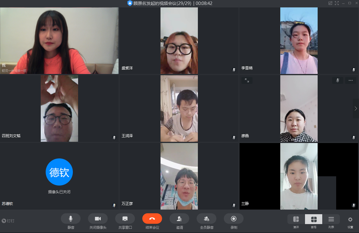 65日,19级四班用钉钉进行了以“雨涤新夏战疫先,数院齐心御时艰”为主题的线上班会,由团支书主持,围绕着抗击疫情不松懈的中心展开了讨论。