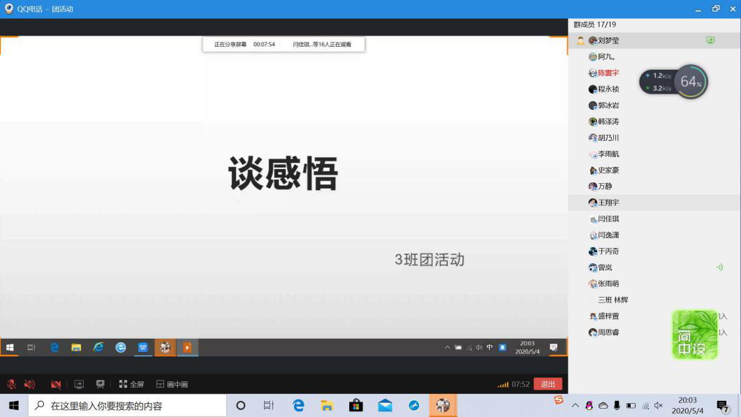 在这次活动中,同学们首先讨论了大家在疫情期间的学习生活。疫情期间,同学都有很好做到对自己与家庭的隔离与防护同时也时时刻刻关注着国内和世界疫情的发展状况。之后,我们便讨论了许多疫情期间的先进事迹,有在一线奋战的人们,更有在我们生活中的“普通人”。我们明白了只有全国上下一心共渡难关,才有我国疫情形势的好转,这是每一个人的努力相加所得的。最后班长总结:作为新时代的青年,要牢记习近平总书记“青年一代有理想、有本领,有担当,国家就有前途,民族就有希望”。关键时刻、危难关头,青年们不畏艰险繁难认真履职尽责,为疫情防控斗争作出重要贡献。同学们要向他们学习,接过他们手中的旗帜,以在自己的岗位上,在党和人民最需要的地方绽放绚丽之花