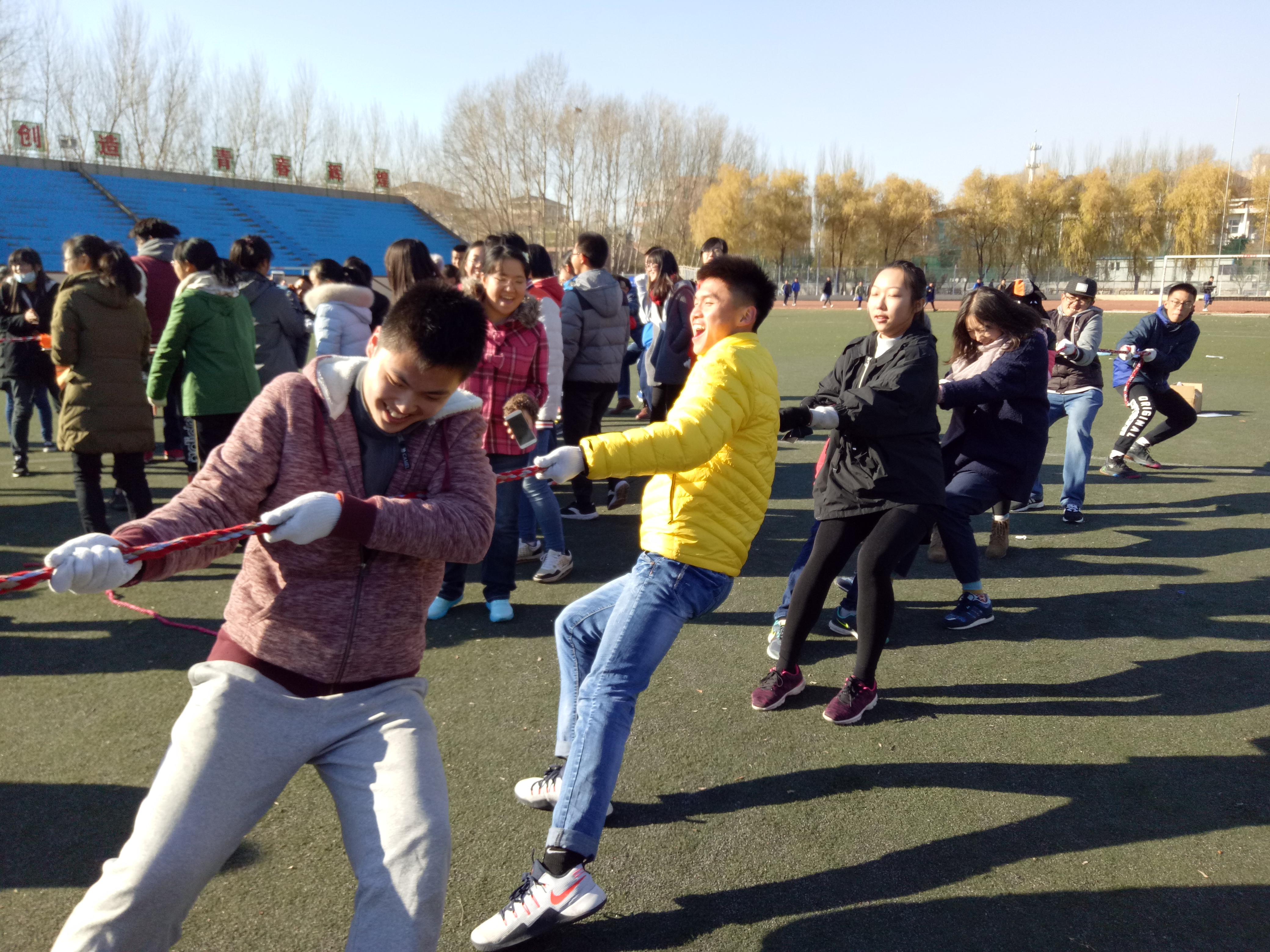 第一个环节是“五毛一块”。游戏中同学自由组合,在最短的时间内组成裁判所要求钱数的小团队获胜。本环的游戏激发了同学们的游戏热情,使大家都能迅速地参与进来。随后,又紧接着进行了“吸管传纸环”“拔河”“四项接力”这些紧张有趣的游戏环节。通过这些游戏环节,同学们既赢得了奖品,又收获了欢笑。