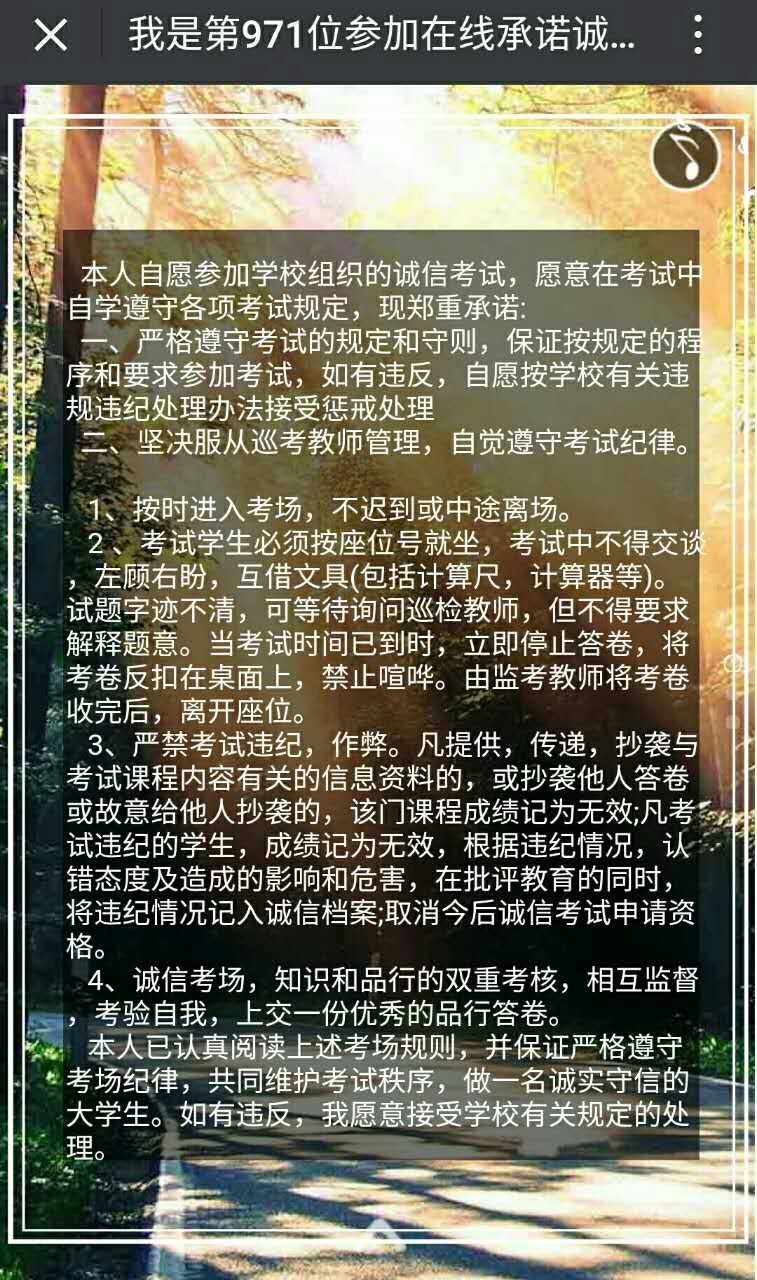 为了树立诚信考试的观念,营造风清气正的学习氛围,12月24日,新媒体中心微平台发起了主题为“诚信考试,我承诺”的线上诚信考试承诺书签署活动。