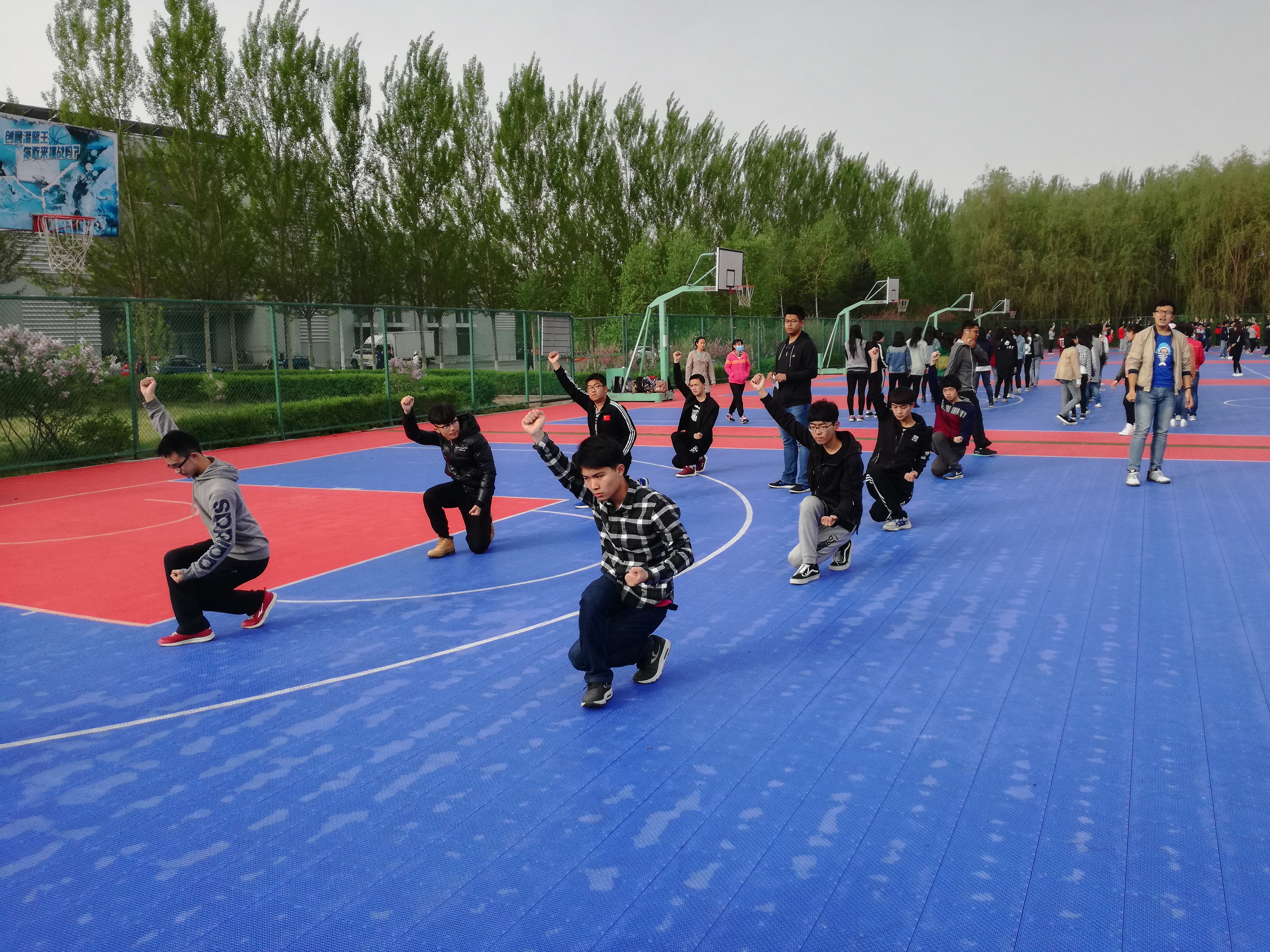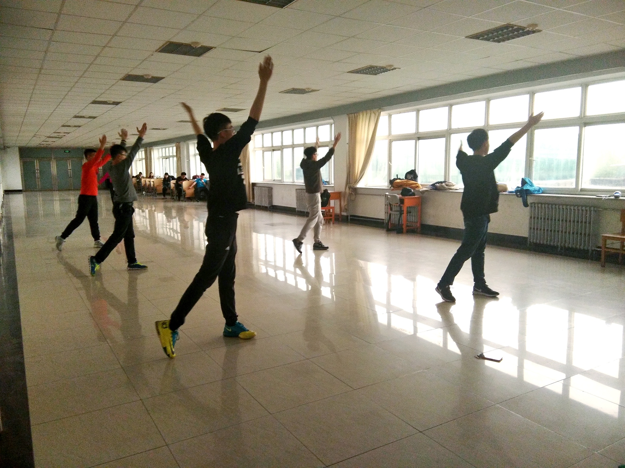 每早六点,参加太极拳和三路长拳训练的同学们准时到达训练场地。接着,在员工会女综部和生管会的带领下开始训练。一边是以柔著称的太极,一边是以刚著称的三路长拳。相比已经学了一学期的长拳,太极拳是大多数同学之前从未接触过的。但在“小老师们”的指导下,大家很快就能领悟到其精髓,打起拳来更是一招一式绝不含糊。大舞和广播体操一般在晚上排练。虽说初高中也学过类似的广播体操,但这一套广播体操更能凸显出老员工的朝气。大舞的排练现场,气氛更是十分活跃。律动的音乐加上同学们优美的舞姿,无一不展现出青春的活力。