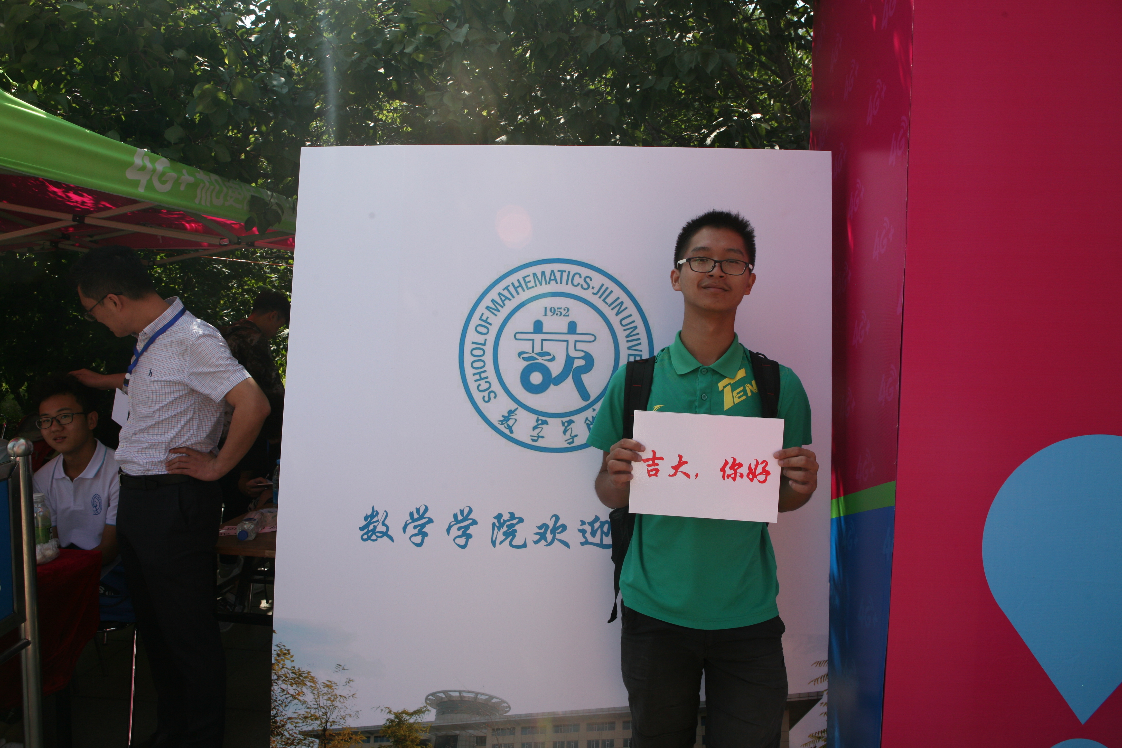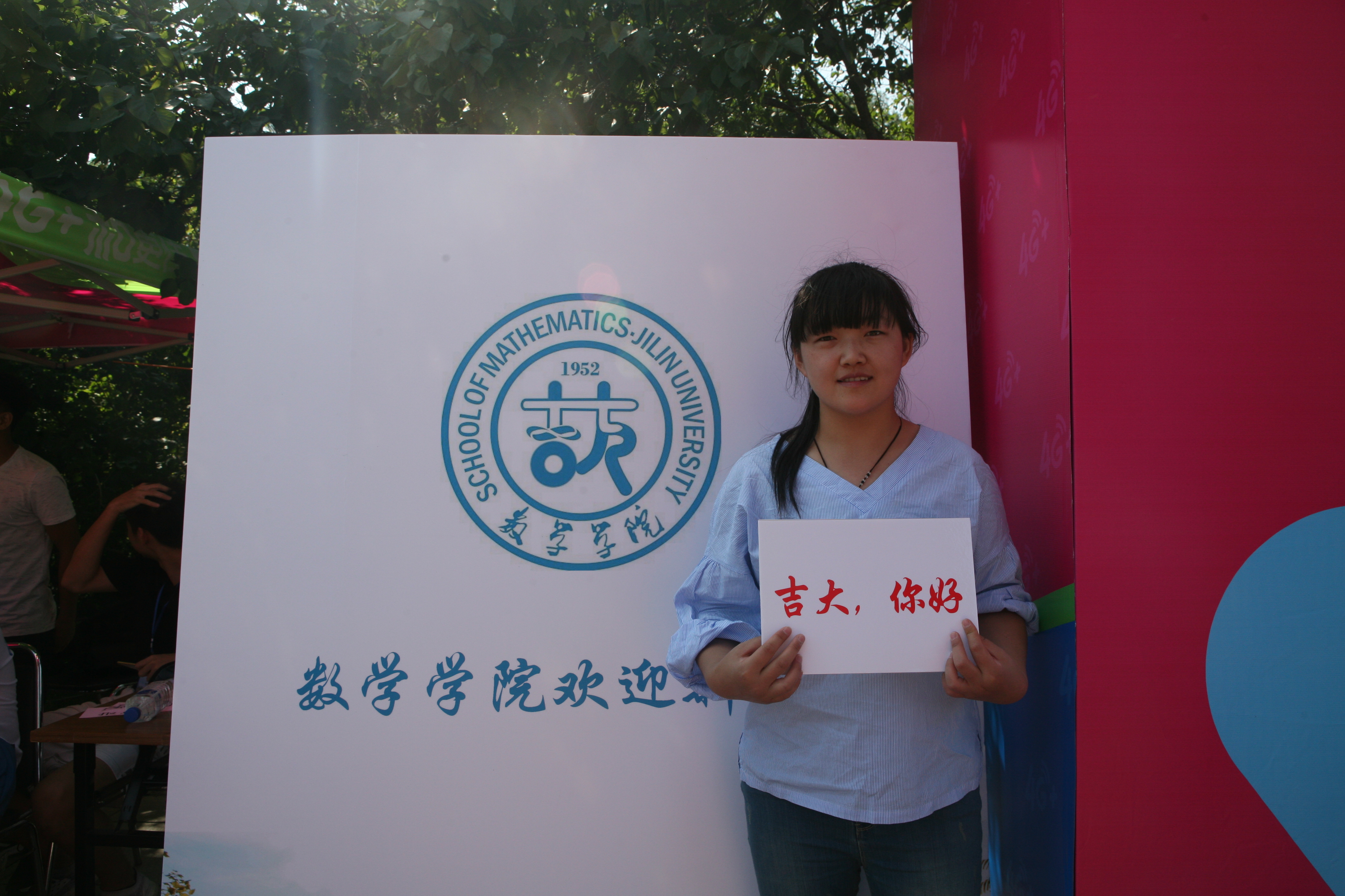 迎新期间,17级数院新生都会将签好名字的便签贴在印有院徽的宣传板上,之后举着写有“你好吉大”、“以梦为马,不负韶华”等标语的手牌拍照留念,怀着对老员工活的憧憬,将最美的笑容定格。
