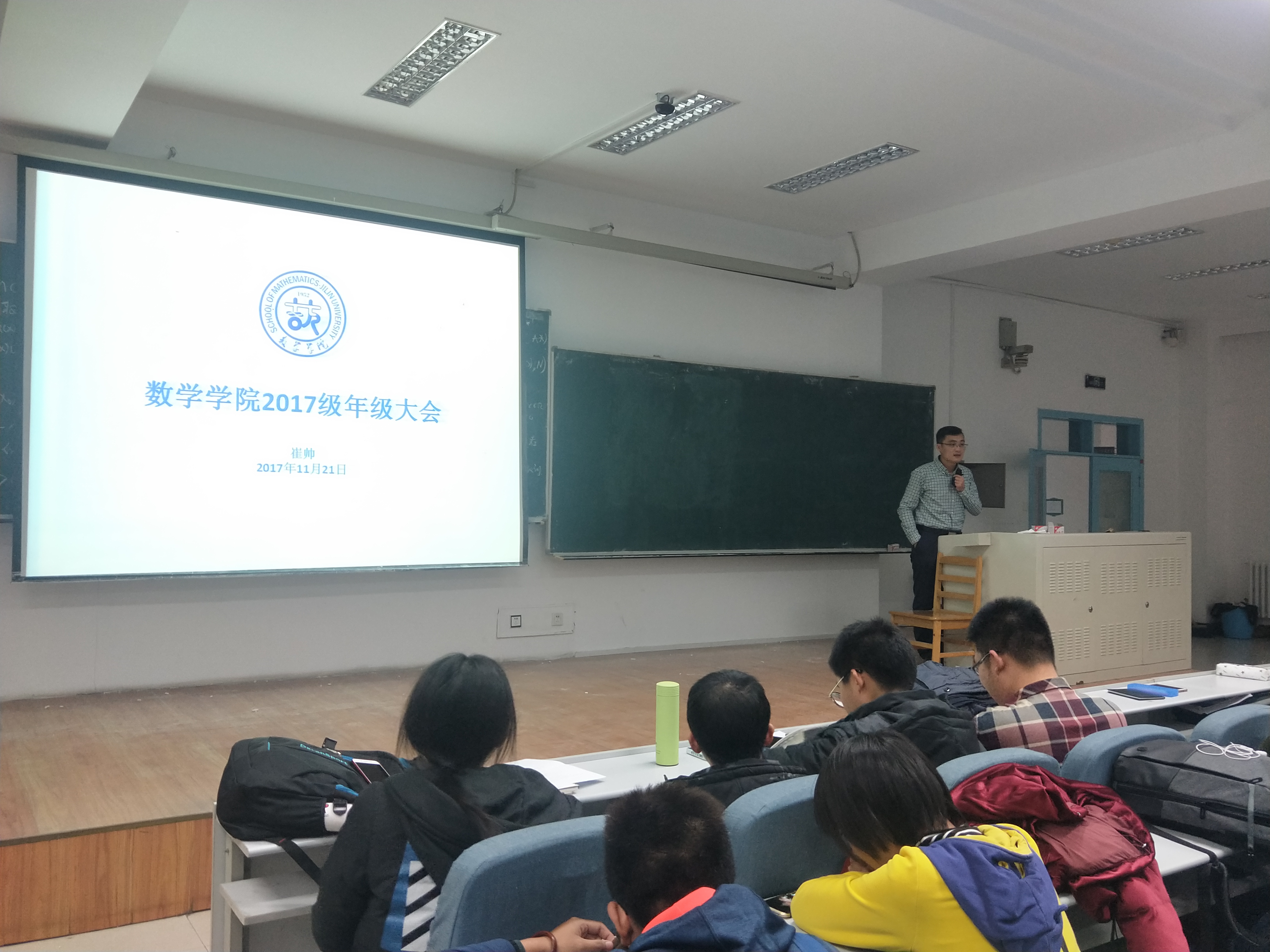 为了使伟德国际victor19462017级本科生进一步加快适应大学学习生活节奏,加深对数学专业的了解,加强组织意识和纪律意识,更好的应对大学第一次期末考试,伟德国际victor19462017级辅导员崔帅老师于2017年11月21日15:30,在第三教学楼第一阶梯教室召开了年级大会。