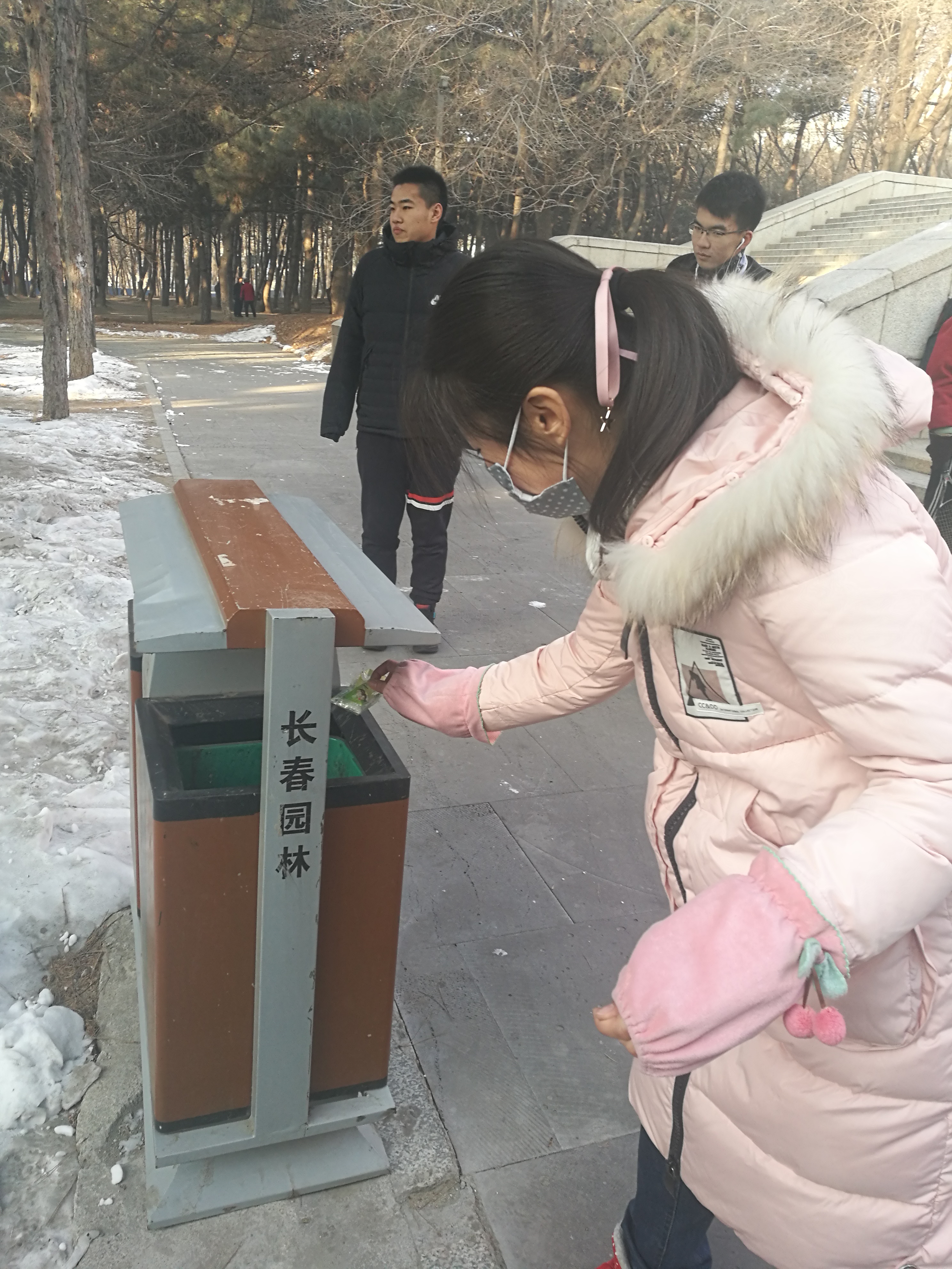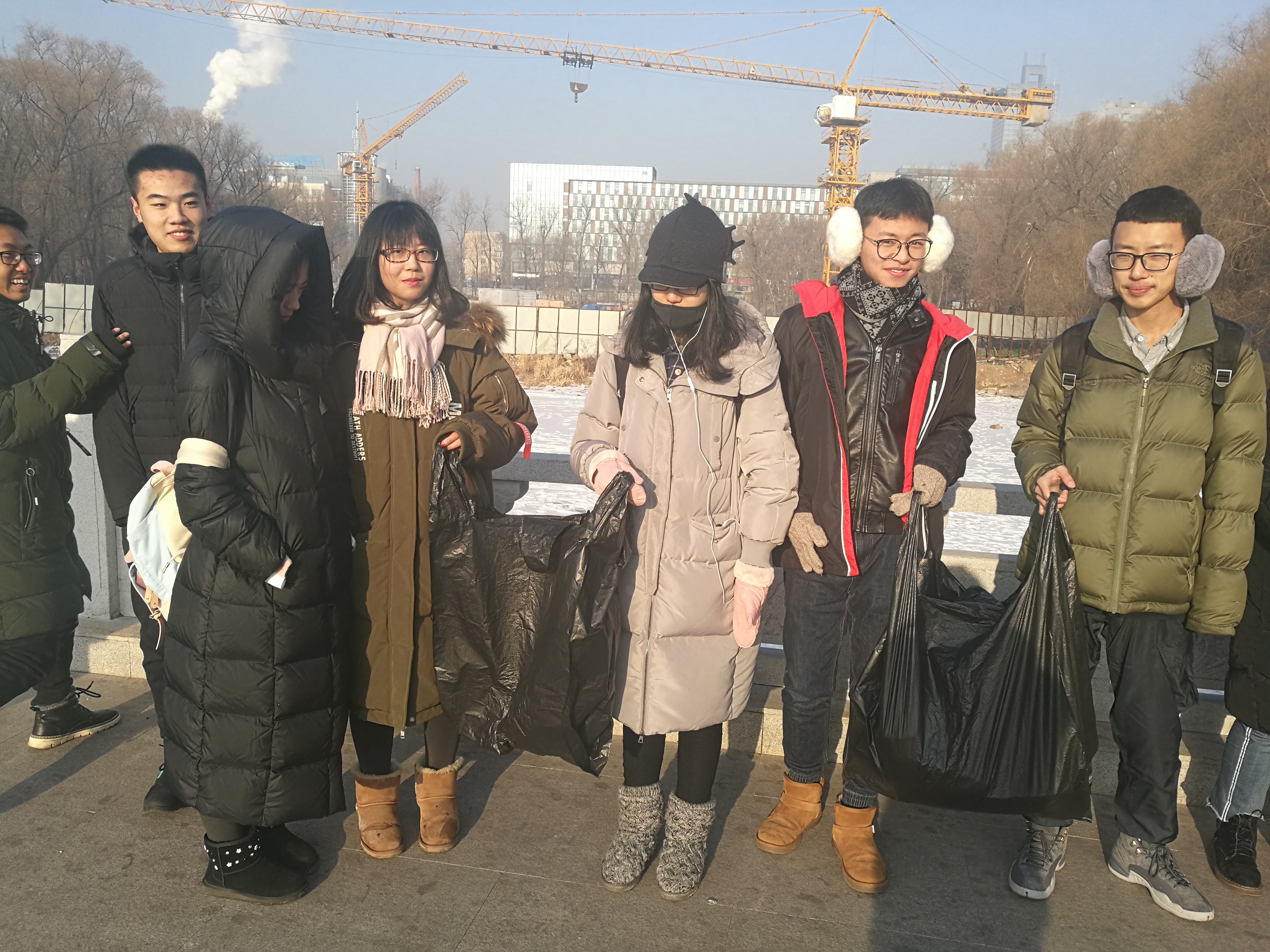 当日上午九点我们以班级为单位在南湖公园集合,虽然已是北方深冬,寒风凛冽,但丝毫未削减同学们志愿为环保出力的热情。我们分成了四个小组,每组一个垃圾袋,分区域对南湖公园进行简单清扫。将垃圾集中到自带的垃圾袋里送到指定的垃圾回收点。很多同学的双手已经冻得发红,但依然坚持捡垃圾。经过一个上午的劳动,俩个大垃圾袋被装得满满的。正午的阳光打在每个人身上,卸下了我们一身的疲惫与寒冷。最后我们在南湖的冰面上合影留念,纪念着这个集体有意义的一天。