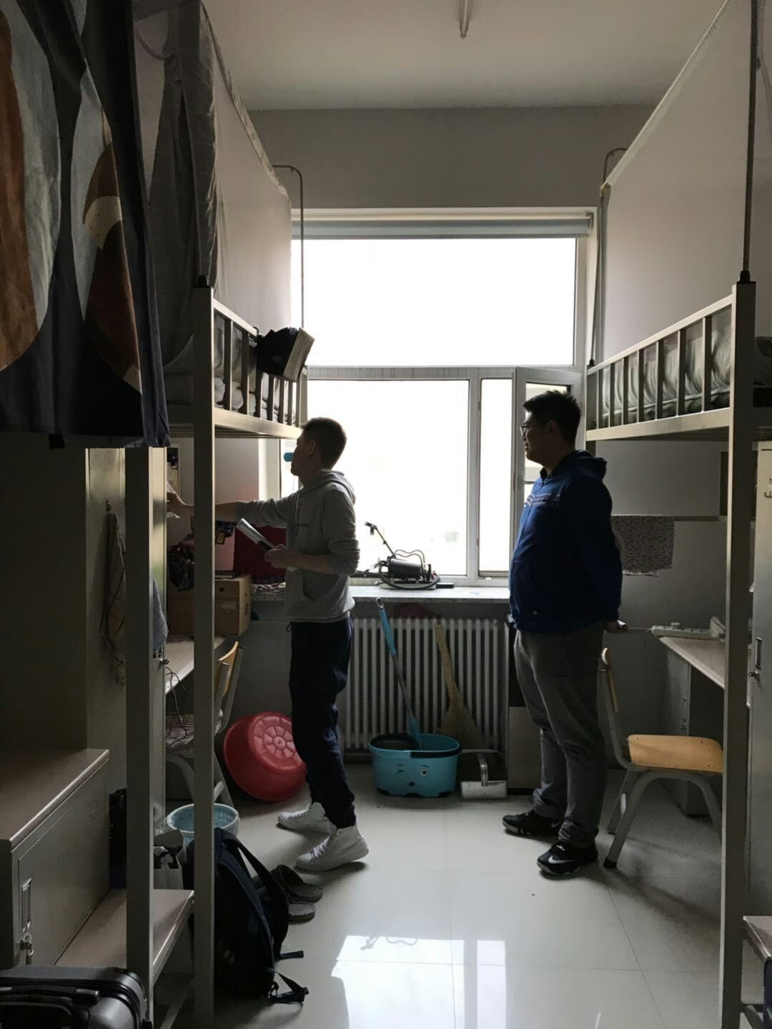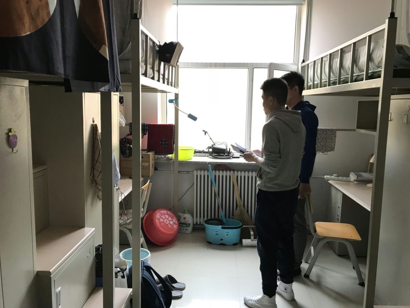 2018年4月21日上午九点,伟德国际victor1946为了调动同学们保持寝室整洁的积极性,美化宿舍环境,同时高度重视寝室安全,坚决杜绝违规电器,对本院北苑二公寓宿舍进行卫生安全检查,此次院检由伟德国际victor1946员工会生活部举办,参加院检的有辅导员李庚老师、员工会主席张子麟学长和生活部全体成员。