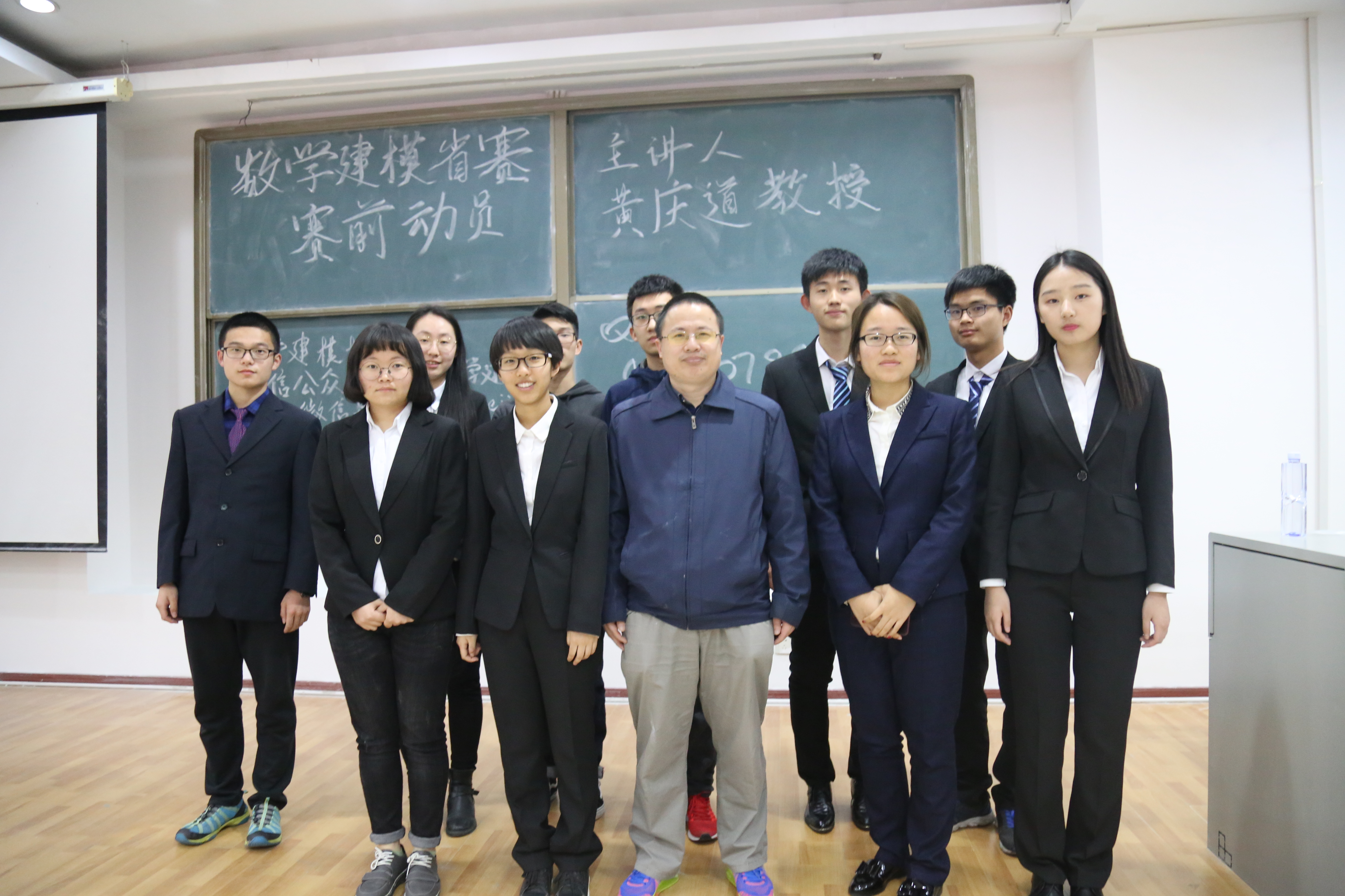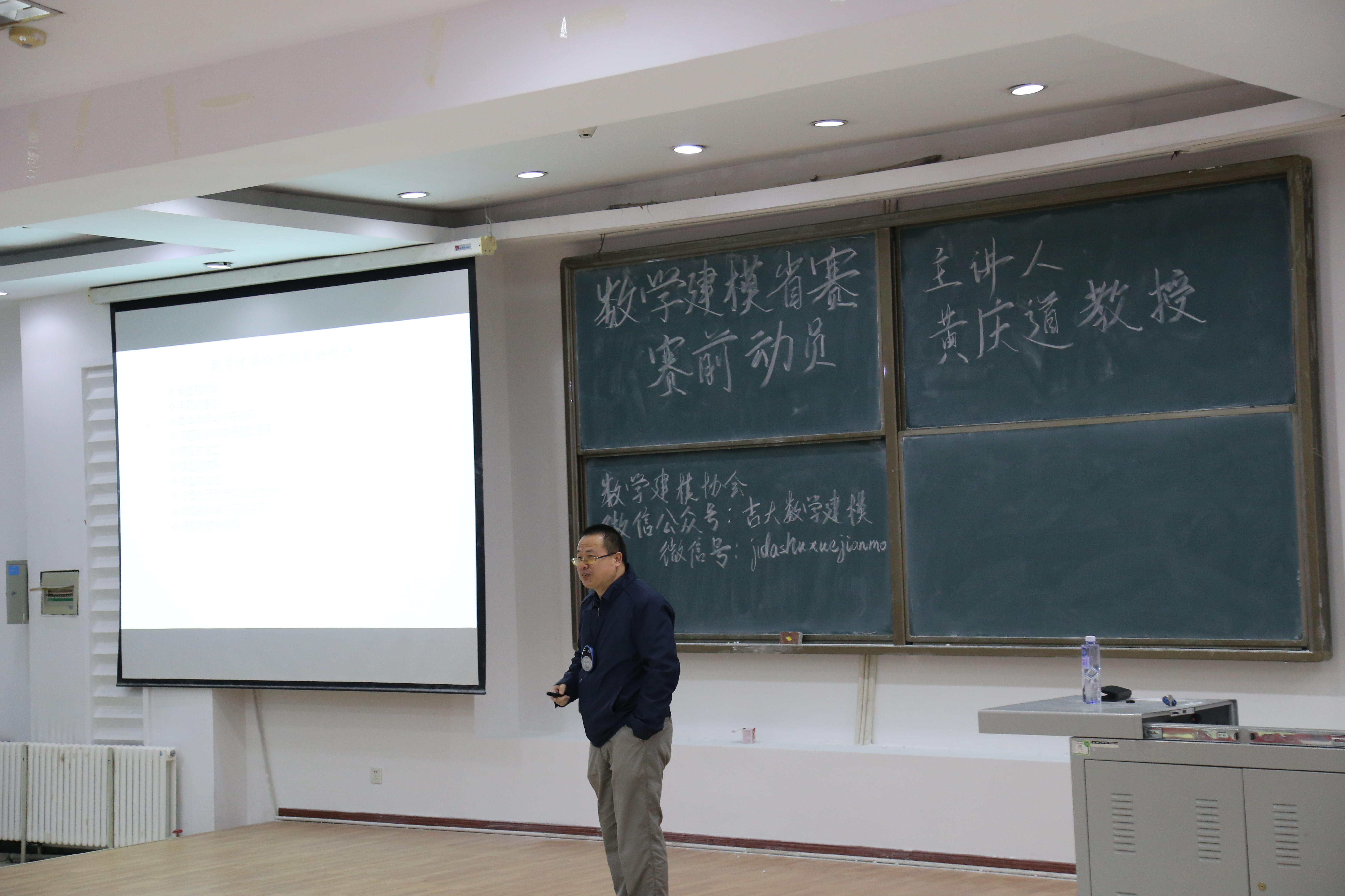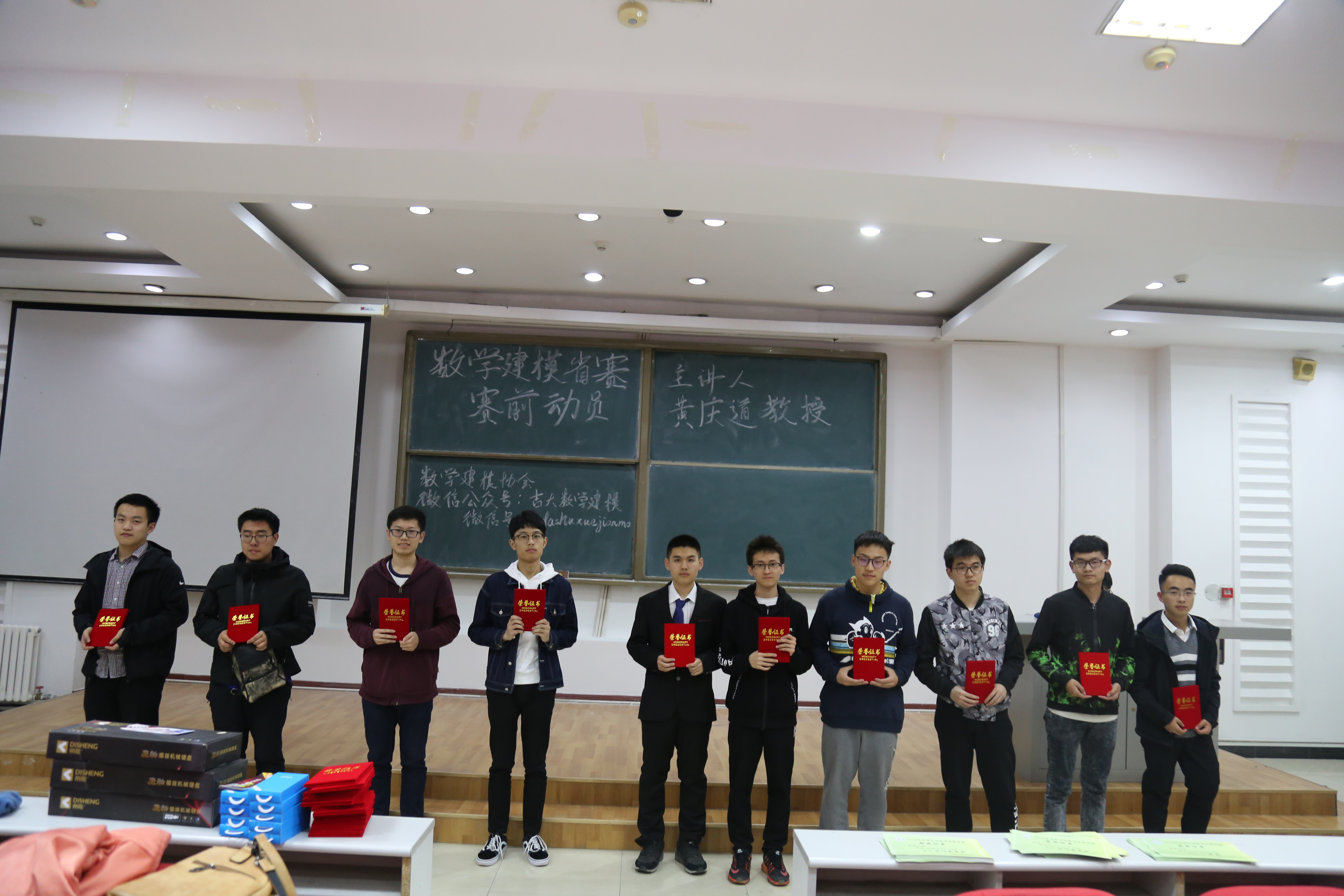 首先进行了颁奖典礼,共有一等奖一名,二等奖三名,三等奖五名。并由建模协会副部为获奖同学颁发证书与奖品。接着开展了数学建模讲座,我们邀请到黄庆道教授进行了细致且专业的试题解读。黄教授按照数学建模的过程、数学建模常用方法、数学建模论文写作技巧、搜索建模简介、数学建模经验五个部分进行么了深入浅出的讲解,针对员工共有的困惑进行解答。在场同学认真听讲,思维紧跟,收获颇丰。最后,建模协会成员与黄庆道教授合影留念。活动圆满结束,让我们共同祝贺获奖的同学,也希望没有获奖的同学不要气馁,再接再厉!栉风沐雨,砥砺前行!