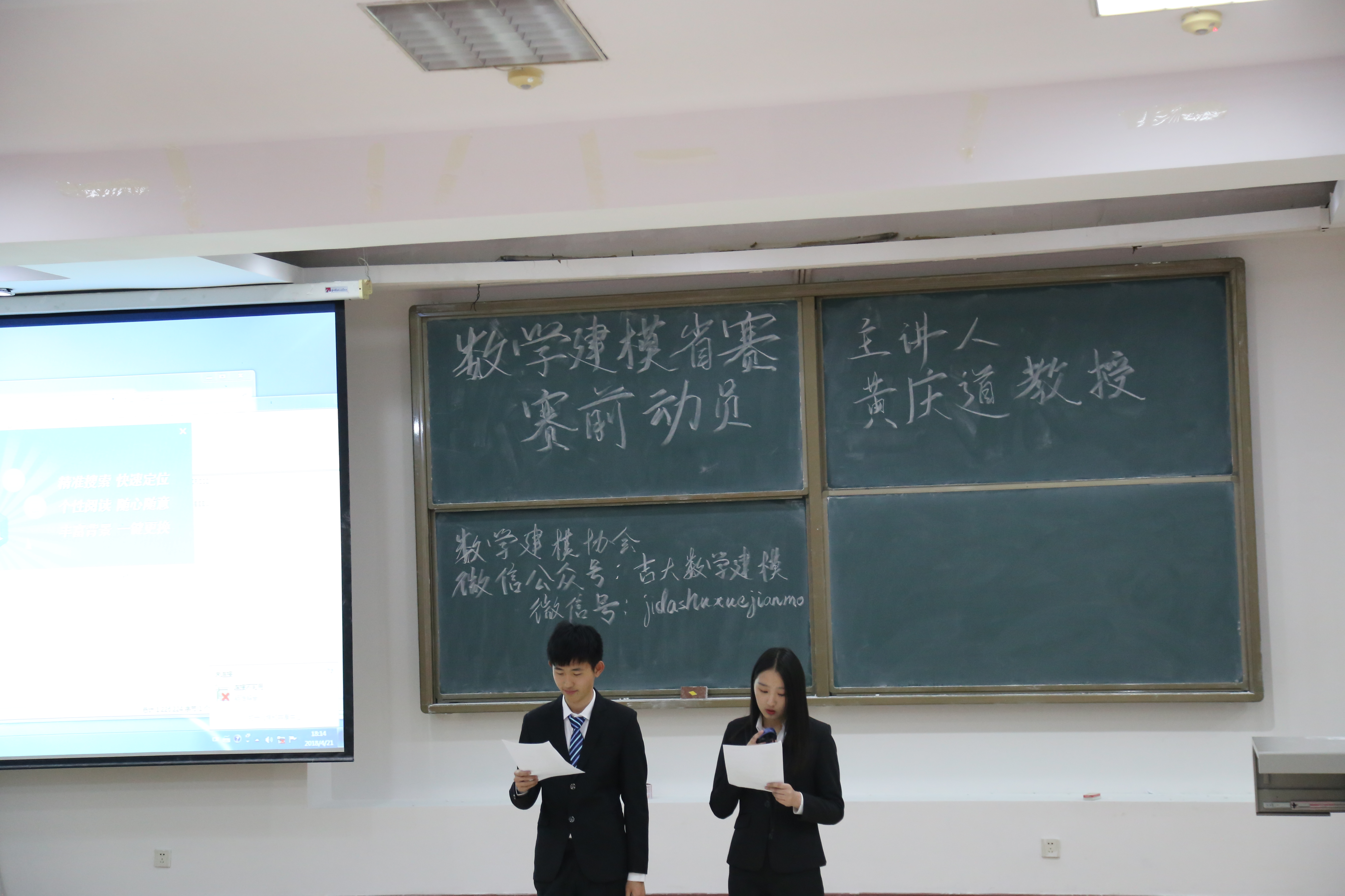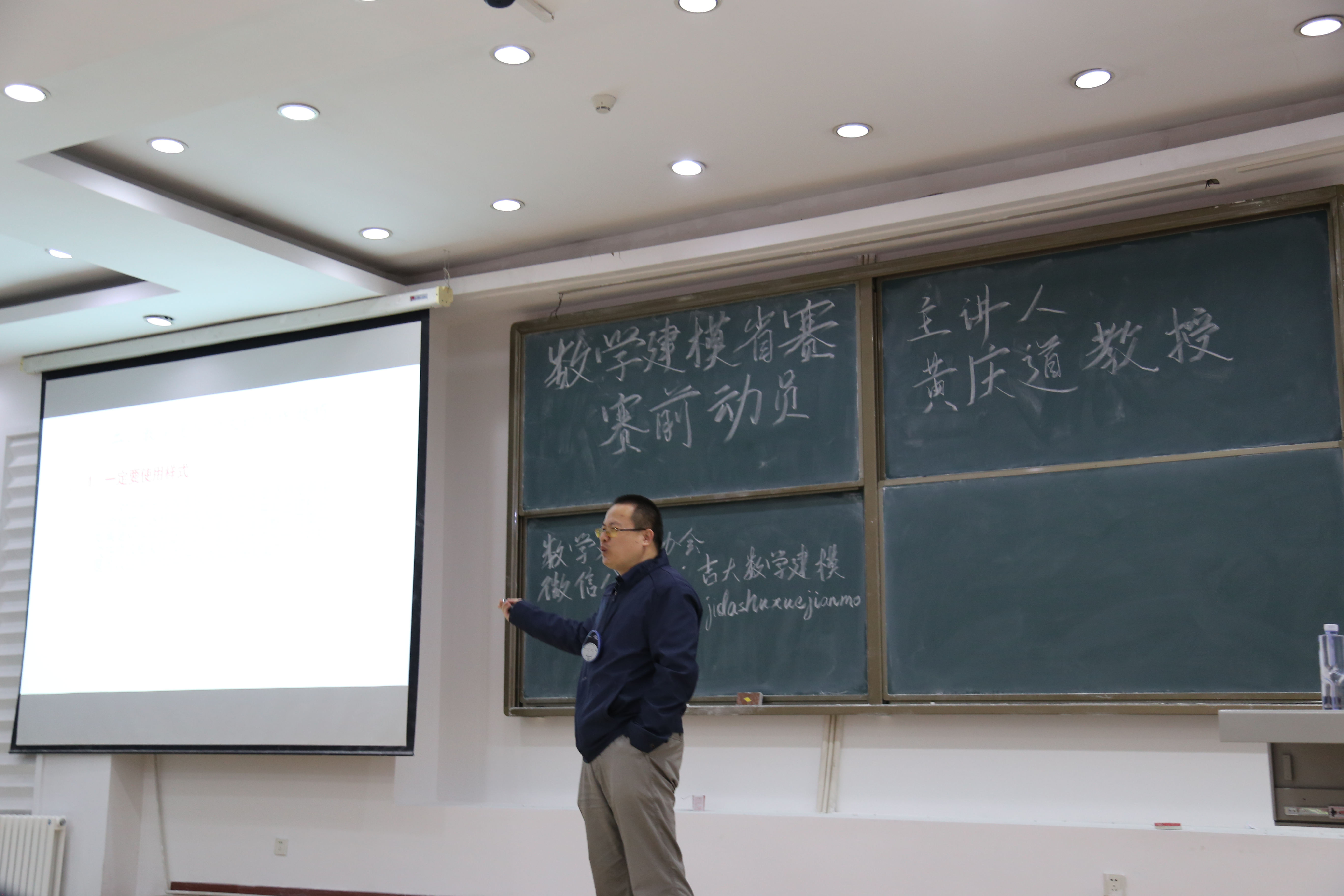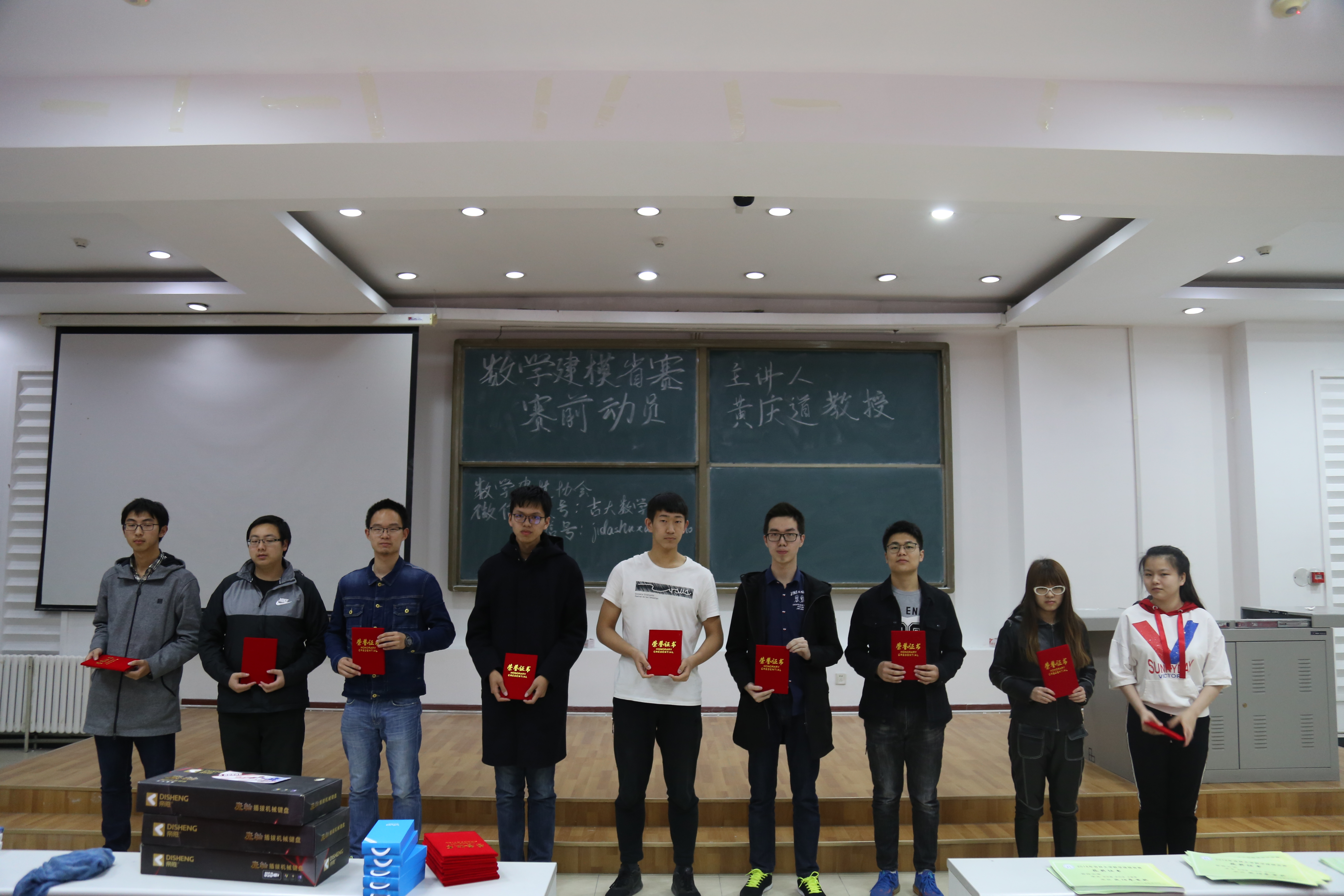 首先进行了颁奖典礼,共有一等奖一名,二等奖三名,三等奖五名。并由建模协会副部为获奖同学颁发证书与奖品。接着开展了数学建模讲座,我们邀请到黄庆道教授进行了细致且专业的试题解读。黄教授按照数学建模的过程、数学建模常用方法、数学建模论文写作技巧、搜索建模简介、数学建模经验五个部分进行么了深入浅出的讲解,针对员工共有的困惑进行解答。在场同学认真听讲,思维紧跟,收获颇丰。最后,建模协会成员与黄庆道教授合影留念。活动圆满结束,让我们共同祝贺获奖的同学,也希望没有获奖的同学不要气馁,再接再厉!栉风沐雨,砥砺前行!