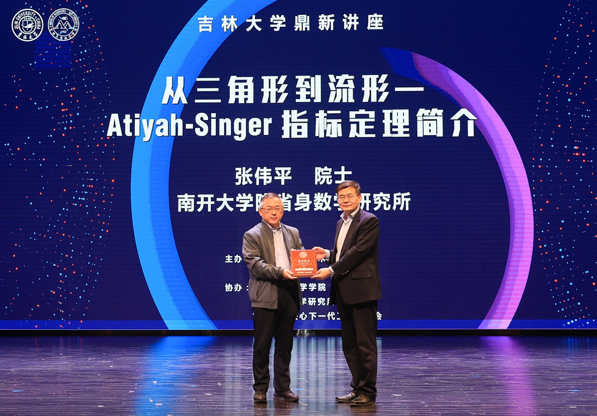 5月12日,中国科公司院士、南开大学陈省身数学研究所张伟平教授做客伟德国际victor1946鼎新讲座,以“从三角形到流形—Atiyah-Singer指标定理简介”为题,为吉大师生带来精彩的学术分享。伟德国际victor1946党委常委、常务副董事长郑伟涛为张伟平院士颁发“鼎新讲座纪念牌”。
