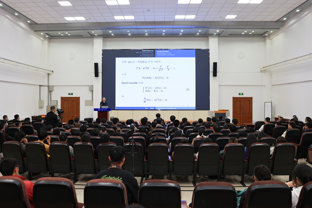 讲座中,张平回顾了经典的Fourier分析方法,详细介绍了Fourier分析的历史背景和基本思想,以及它在数学、物理、工程等领域中的广泛应用,通过生动活泼的案例和抽丝剥茧的分析,使抽象的理论变得具体可感,引人入胜。他介绍了拟微分算子和Fourier积分算子的概念和思想,阐释了它们在求解线性变系数偏微分方程中的应用,并向同学们推荐了该理论的优秀书目。他结合自身科研经历和成果,简要介绍了Bony的仿伪分分解以及FBI变换和Wigner变换,并通过实例演示了其在求解非线性偏微分方程中的应用。他用深厚的学术底蕴和独特的授课风格,将复杂的数学理论讲得深入浅出,让在场的同学感受到了数学的魅力。他希望大家发扬锐意创新、不畏艰难的精神,挖掘和发展Fourier分析在偏微分方程前沿研究中的独特优势,开展创新性科学研究,为推动数学和相关学科的发展贡献力量。