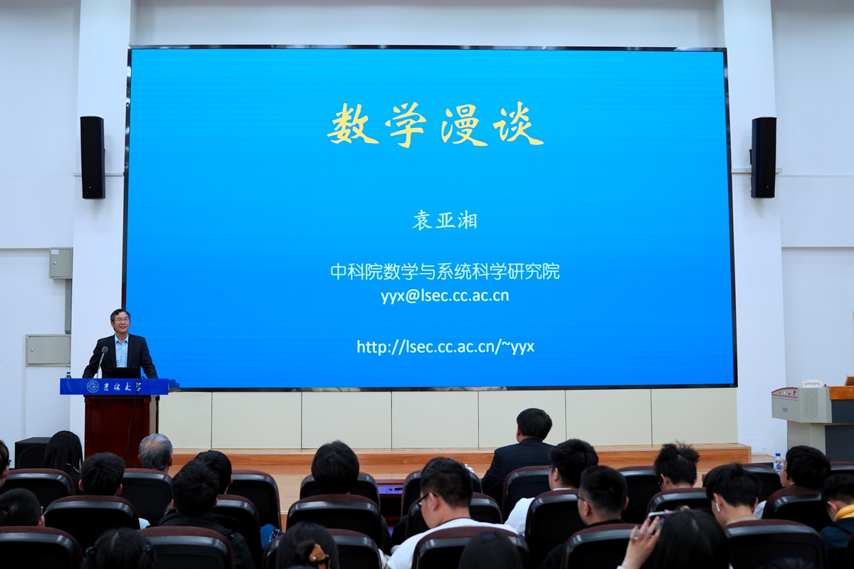 袁亚湘院士围绕数学的定义、特点、作用三个方面展开漫谈。他从国际数学节谈起,介绍了圆周率的相关知识,用“美、真、趣、难、慧”5个字概括了数学的特点。袁亚湘院士介绍,数学作为一门基础学科,作为一种强有力的工具,在大数据、人工智能、天气预报、图像处理等方面发挥着广泛和关键的作用。“数学是一种独特的语言,可以为其他学科的新发现给予指导和表达形式,是紧扣现实且强而有力的工具。”袁亚湘认为,数学与现代生活息息相关,“电脑断层扫描检查、工程建设、地球勘探需要数学的精准计算,我们每日使用的手机通讯、数码拍摄的图像处理,以及金融经济也需要依靠数学运算出来的应用。”袁亚湘院士通过列举数学在计算、自然科学以及其他学科领域上的广泛作用,阐明数学在人类生活中的重要性。讲座结束后,袁亚湘院士与在场师生展开了深入交流,对同学们提出的问题一一进行解答,呼吁同学们要保持和提高对数学的兴趣,并给出学习方法和建议。