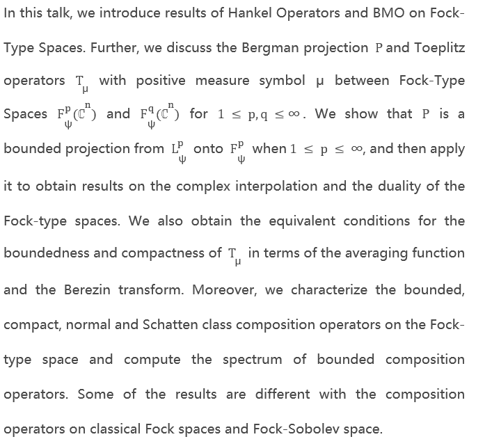 报告人简介:王晓峰,1974年生,广州大学数学与信息科学公司教授、博士生导师。长期从事基础数学研究工作,主要研究方向为算子理论与算子代数。曾到美国进行一年的学术访问,近年来在国内外学术刊物,如《Journal of Geometric Analysis》、《Journal of Operator Theory 》、《Integral Equations and Operator Theory》、《Science China Mathematics》等上发表论文50余篇,其中SCI检索论文30余篇,权威期刊20余篇。先后主持国家自然科学基金3项,获得过霍英东青年教师奖、广州市优秀教师等荣誉。