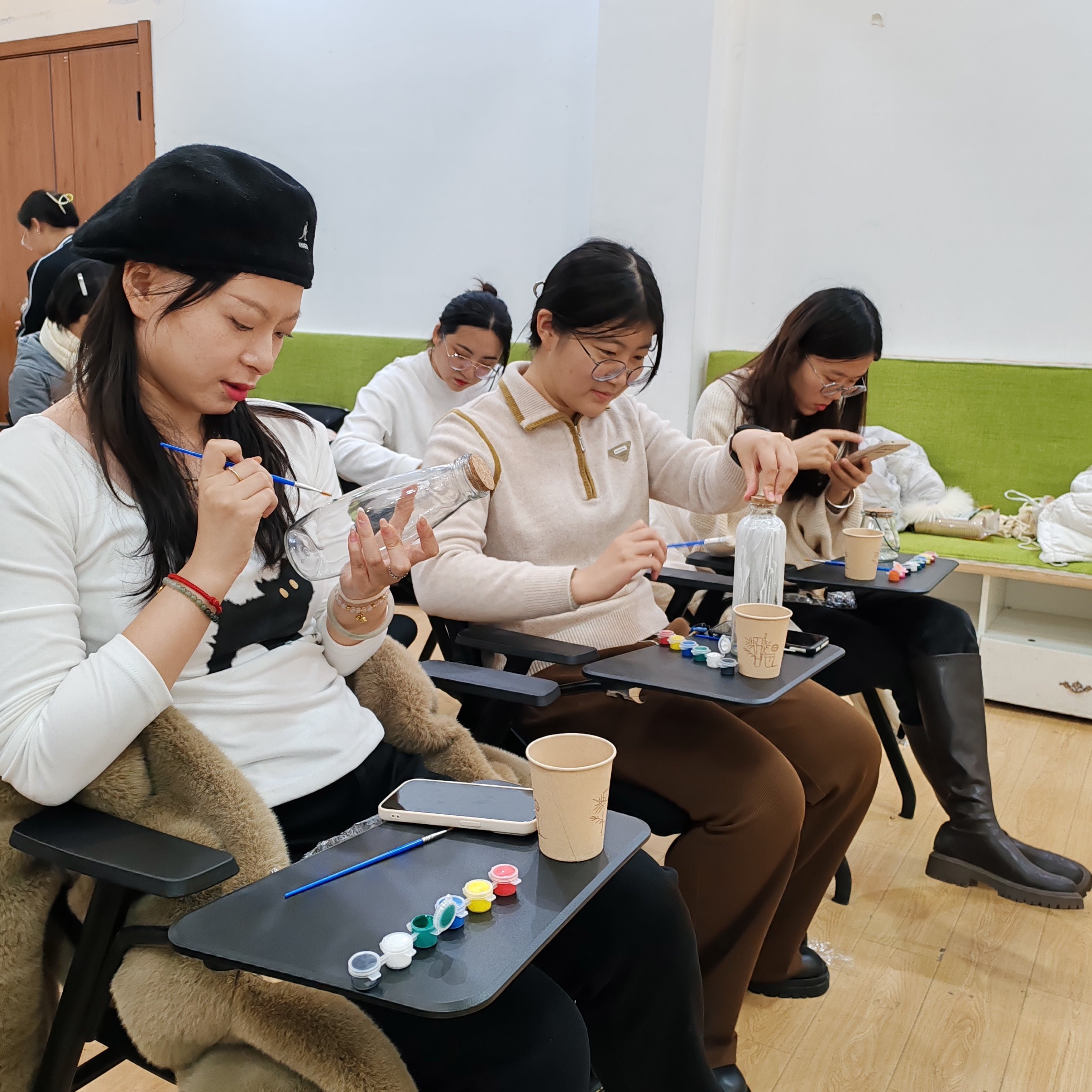 在活动伊始,每位同学都收到了一个材料包,包括了画笔、颜料和一个透明的玻璃瓶。而后,主持人介绍流程,并引导同学们观察、感受自己手中的瓶子。在主持人宣布个人创作环节开始之后,同学们积极投入,用手中的画笔将玻璃瓶点缀成充满个性与韵味的小艺术品。