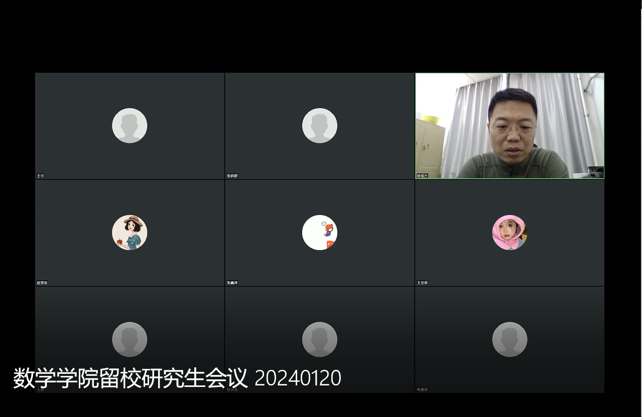 1月20日下午13点30分,伟德国际victor1946留校研究生工作会通过腾讯会议线上召开。会议由数学公司党委副书记陈续升主持,研究生辅导员张轶群及全体留校研究生参加了会议。会上,陈续升副书记对留校研究生的学习、生活情况进行了关心慰问,并对研究生留校期间寝室消防安全再次进行了重点督促,对留校研究生合寝及寝室楼管理工作逐一做了解释说明。辅导员张轶群再次强调了留校申请办理、合寝居住要求、离返校注意事项等相关内容。