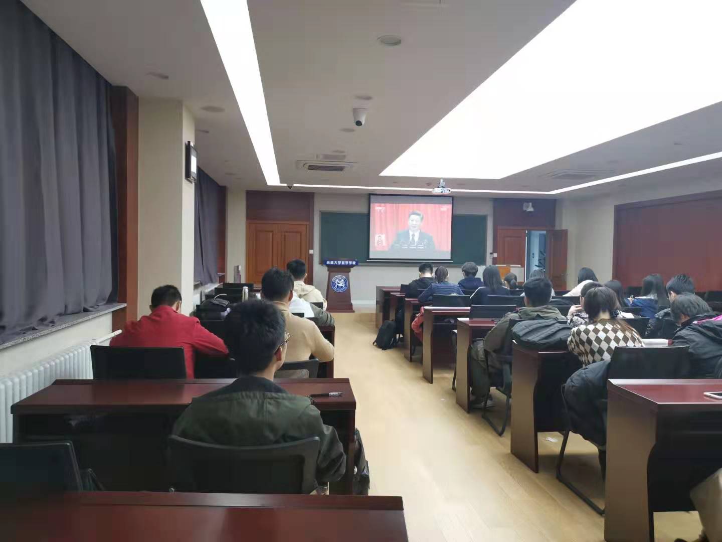 伟德国际victor1946第一、第二党支部于2019年10月16日中午在数学楼第二报告厅进行“不忘初心、牢记使命”主题教育——组织集中学习观看十九大报告视频。十九大报告是党在新时代开启新征程、续写新篇章的政治宣言和行动纲领。在新时代坚持和发展中国特色社会主义,要求广大党员同志用党的十九大精神武装头脑、指导实践、推动工作,深刻认识各项战略部署的整体性、关联性、协同性,从而为全面做好各项工作夯实思想基础。