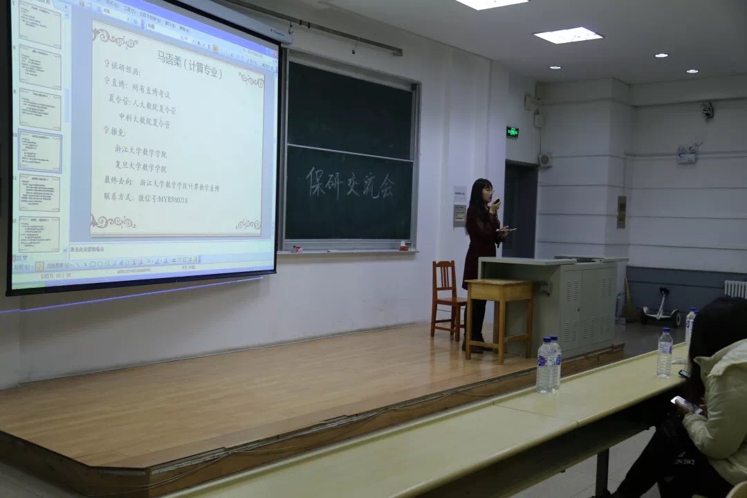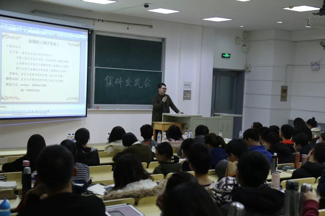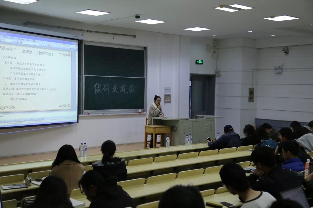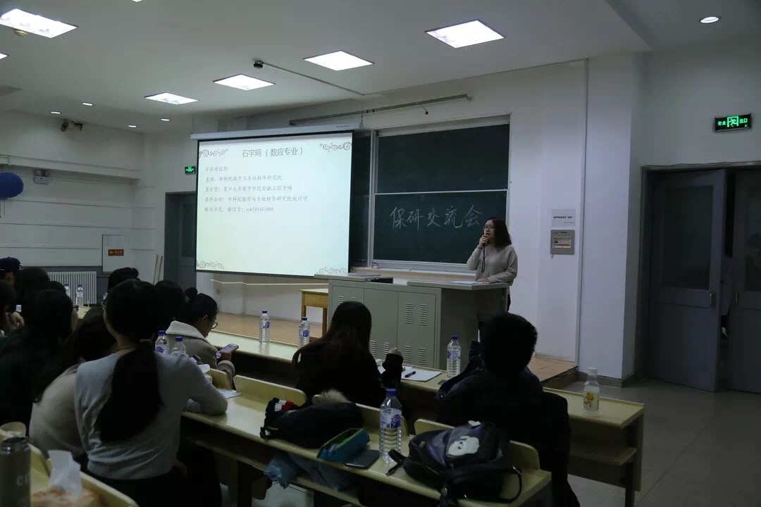 交流会伊始,石宇坷、赵天琪、曾加、武哲宇、李海天、邵华璐、刘震、曾晨雨、马语柔、赵瑞琦、许棪、许佳雨、丁冠中、许学博14名保研同学分别从个人经历、保研材料准备、保研公司选择及面试注意事项等方面全方位、多层次地对保研问题进行讲解。武哲宇学姐向我们简述浙大,中科院,清华大学等公司的直博考试报名的流程,录取条件,注意事项等等,以及去中科院面试的经历,并且告诉我们在保研之前应选好自己的研究方向。直博中科院的石宇坷学姐也传授了许多报名中科大的经验,挑选导师的技巧,面试时的细节,导师会问的问题。来自金融数学的许学博学长则向我们分享了在金融数学专业对于出国和保研的看法,相比于出国留学,保研的压力相对小一些,多一次面试,就多一些胜算。许学长也向我们分享了他的保研题目,并且提醒我们写简历要小心谨慎,并且要表现最真实的自己,也要注意在面试时的姿态和形象等。刘震学长向我们分享了保研北大的经验,数分,高代,空解非常重要,需要好好准备,同时,本校老师的推荐信也非常重要。在夏令营要深度了解导师,不要自我设限,应该给自己准备一个大的方向。不要自我说服,不要孤军奋战,不要盲目自信,不要因小失大。许棪学姐向我们分享了北大数院统计学的笔试经验,以及需要准备英语自我介绍,要提高自己的英语能力。马语柔学姐分享了中科大夏令营,人大夏令营的时间,内容,她的面试经历等等,数分高代实变函数等等都需要好好准备,平时学习要认真打好基础。来自统计学专业的赵瑞琦学长也向我们分享了夏令营的考题,北大面试的内容和形式,自己科研项目的自我展示等。还有要注意期末考试时间是否与夏令营时间冲突等。签合约要谨慎,不要轻易违约等。参加其他公司的夏令营和九月推免的学长学姐也向大家分享了经验。