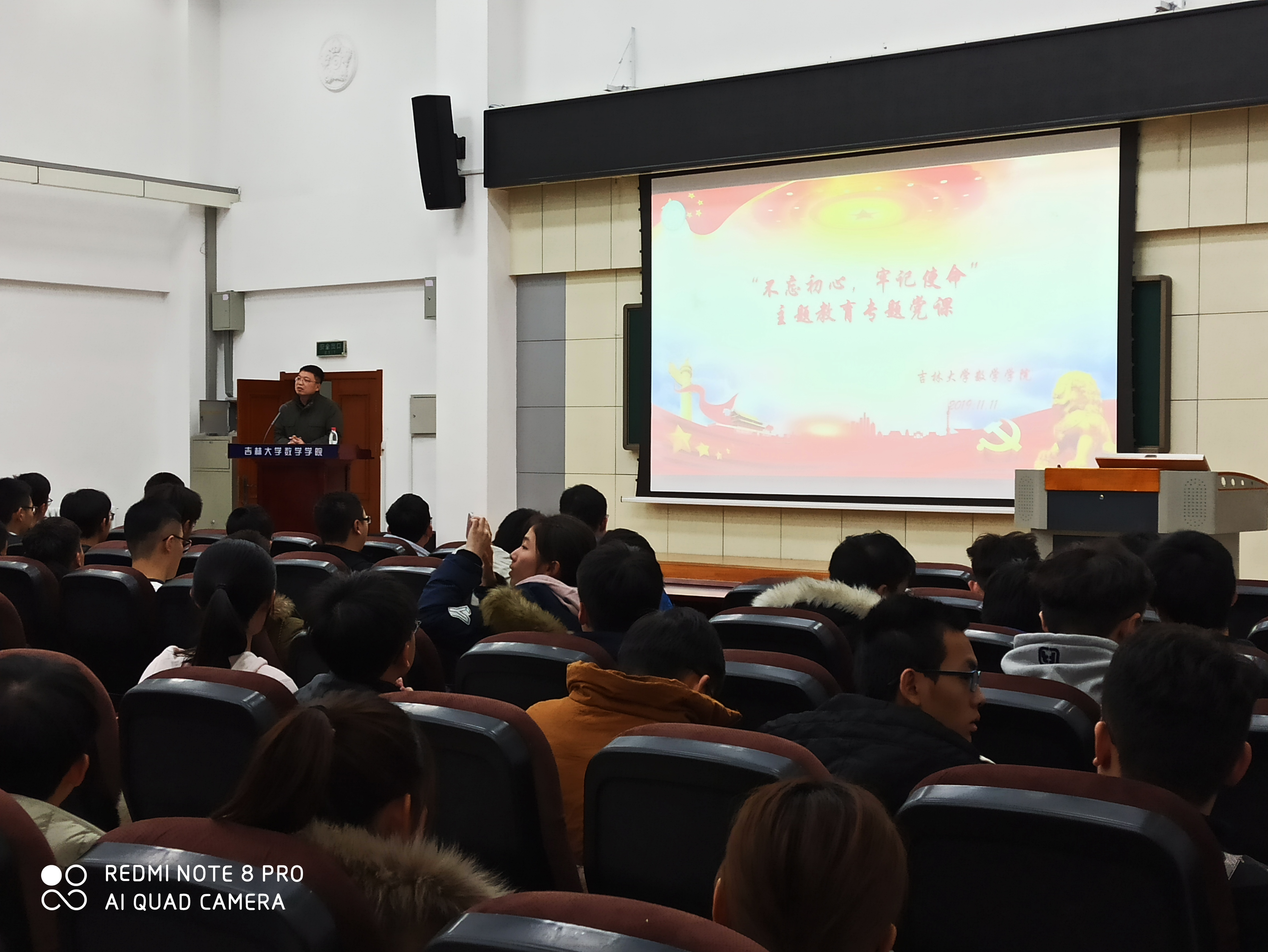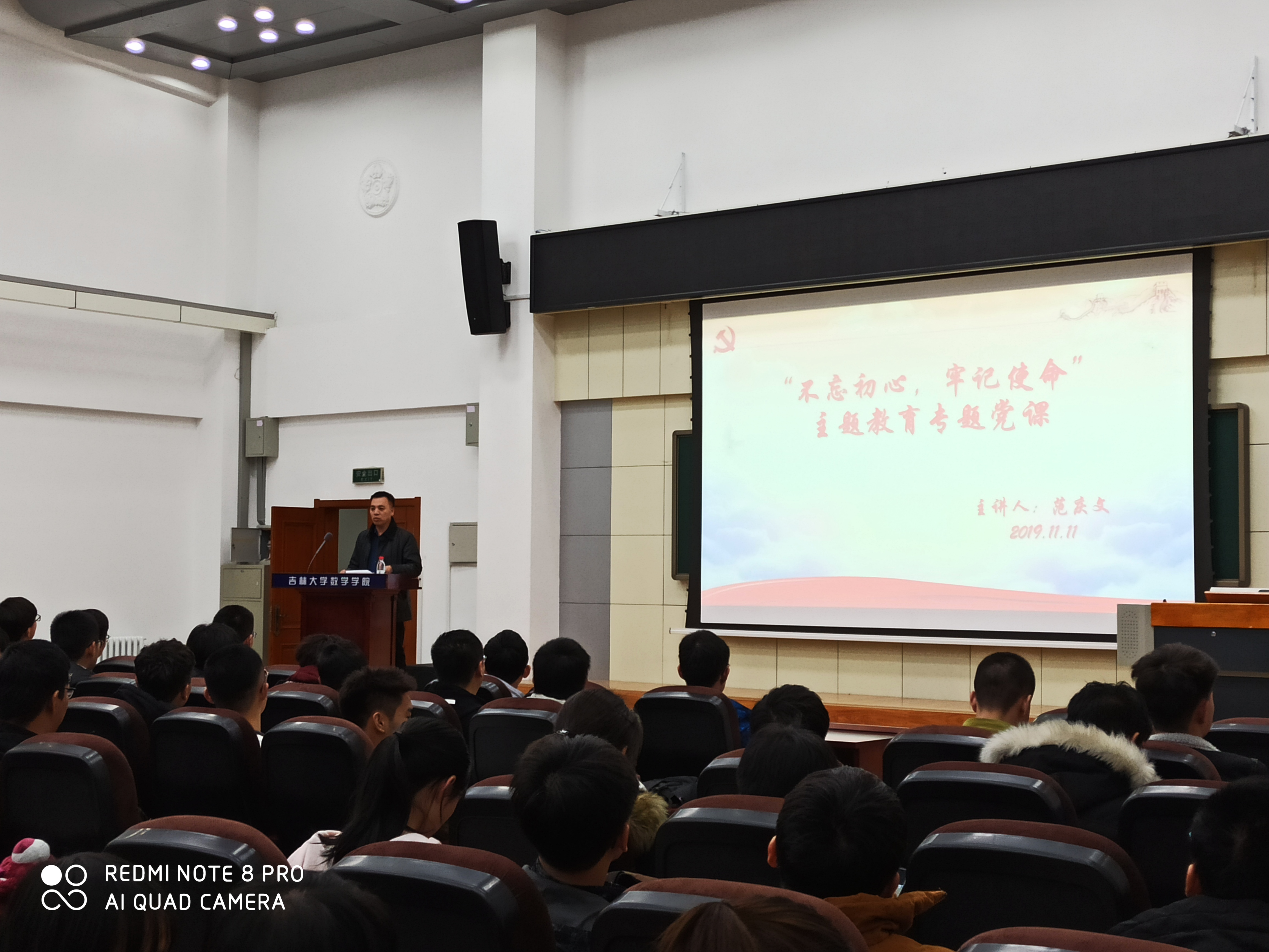 伟德国际victor1946副经理陈续升老师、党委副书记范庆文老师于20191111日下午在数学楼二楼报告厅组织2017级同学开展“不忘初心,牢记使命”主题党课。此次党课旨在让同学们更加深入地学习和理解习近平总书记在中华人民共和国成立七十周年大会上的讲话,感受祖国七十年沧桑巨变,坚定同学们努力奋斗的决心。