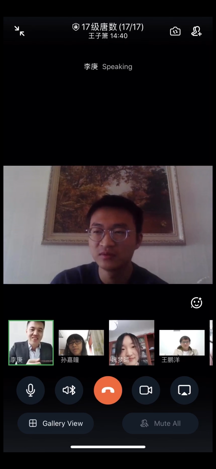 本次出席人员有2017级唐敖庆班全体同学和辅导员李庚。首先,李庚老师向大家说明了公司防疫工作的各项措施,强调了公司对同学们居家防疫的要求。接着,李庚老师与大家共勉了习主席写给北京大学援鄂医疗队全体“90党员的回信。信中说青年一代有理想、有本领、有担当,国家就有前途,民族就有希望,深深鼓舞了班级的同学,同学们都纷纷分享自己身边经历过或者听说过的感人事迹,如自己的高中同学作为青年志愿者参与社区服务工作,驰援湖北的4.2万医护人员中有1.2万是90后、00后。