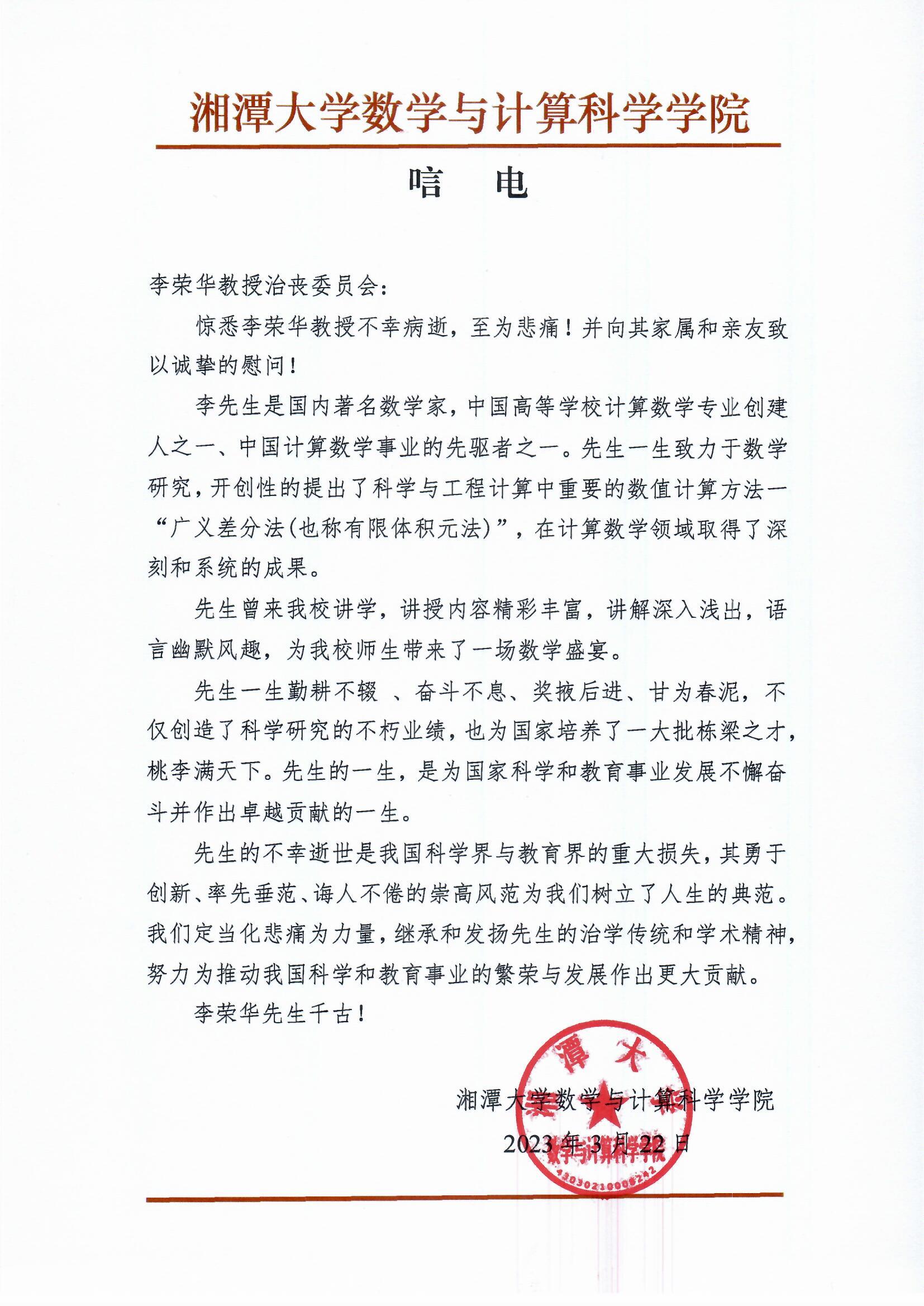 湘潭大学数学与计算科学公司唁电