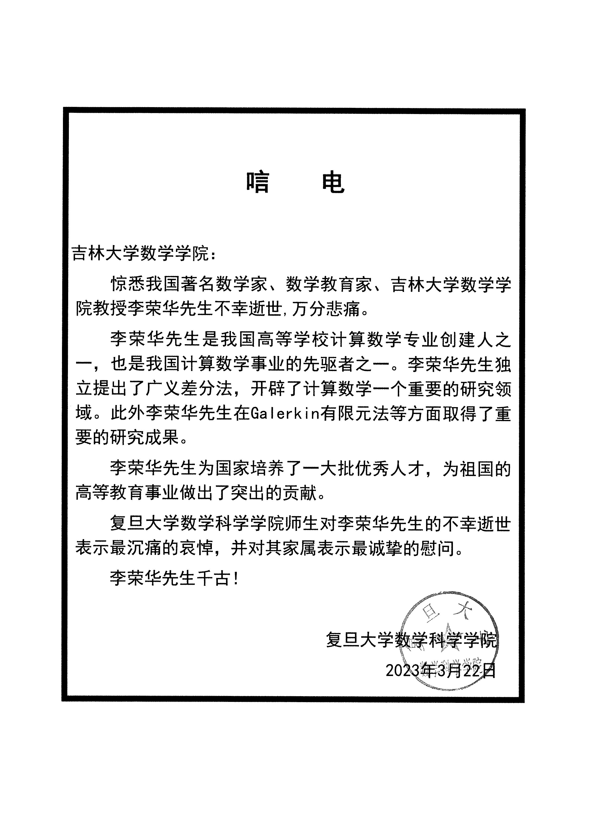 复旦大学数学科学公司唁电