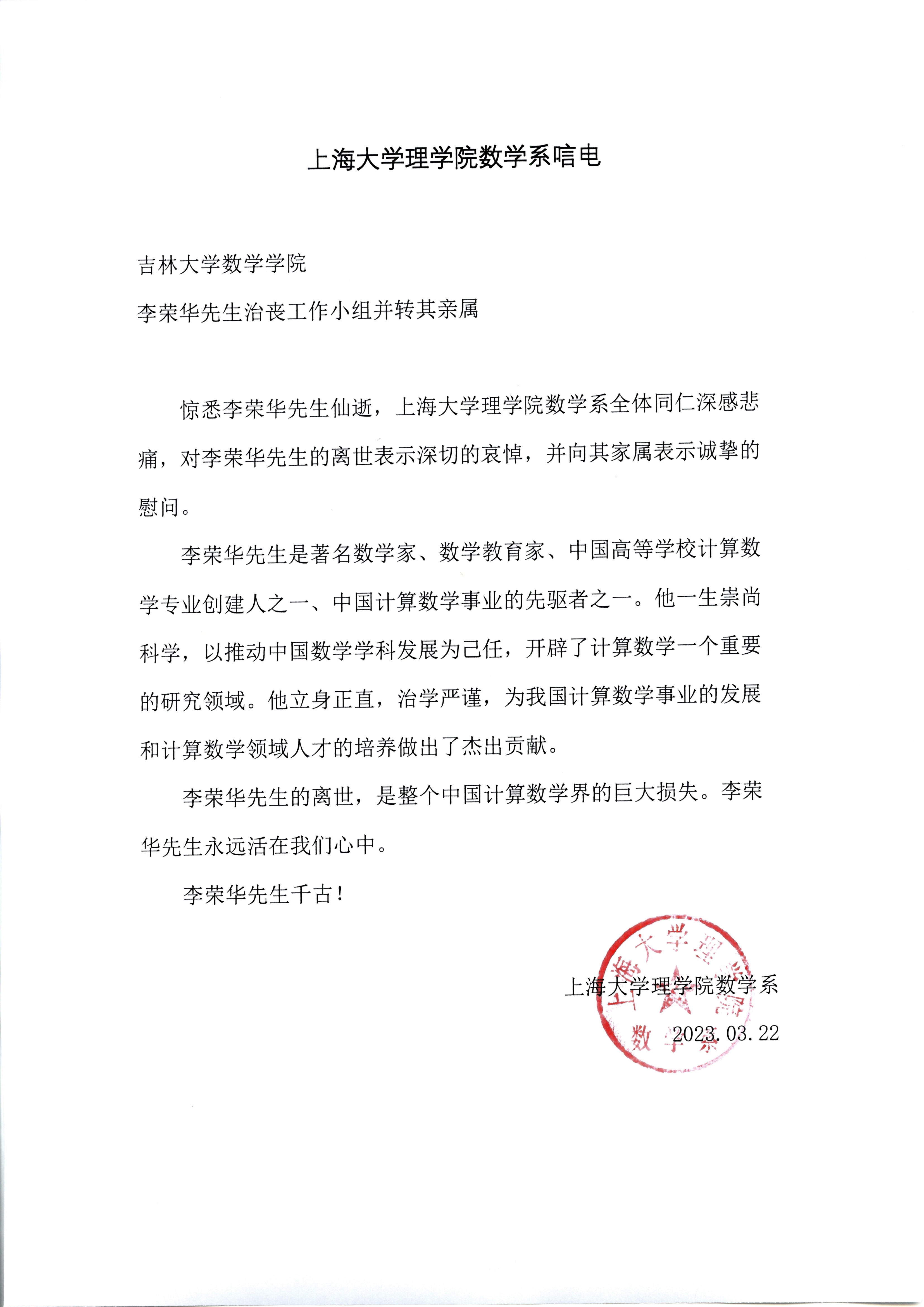 上海大学理公司数学系唁电
