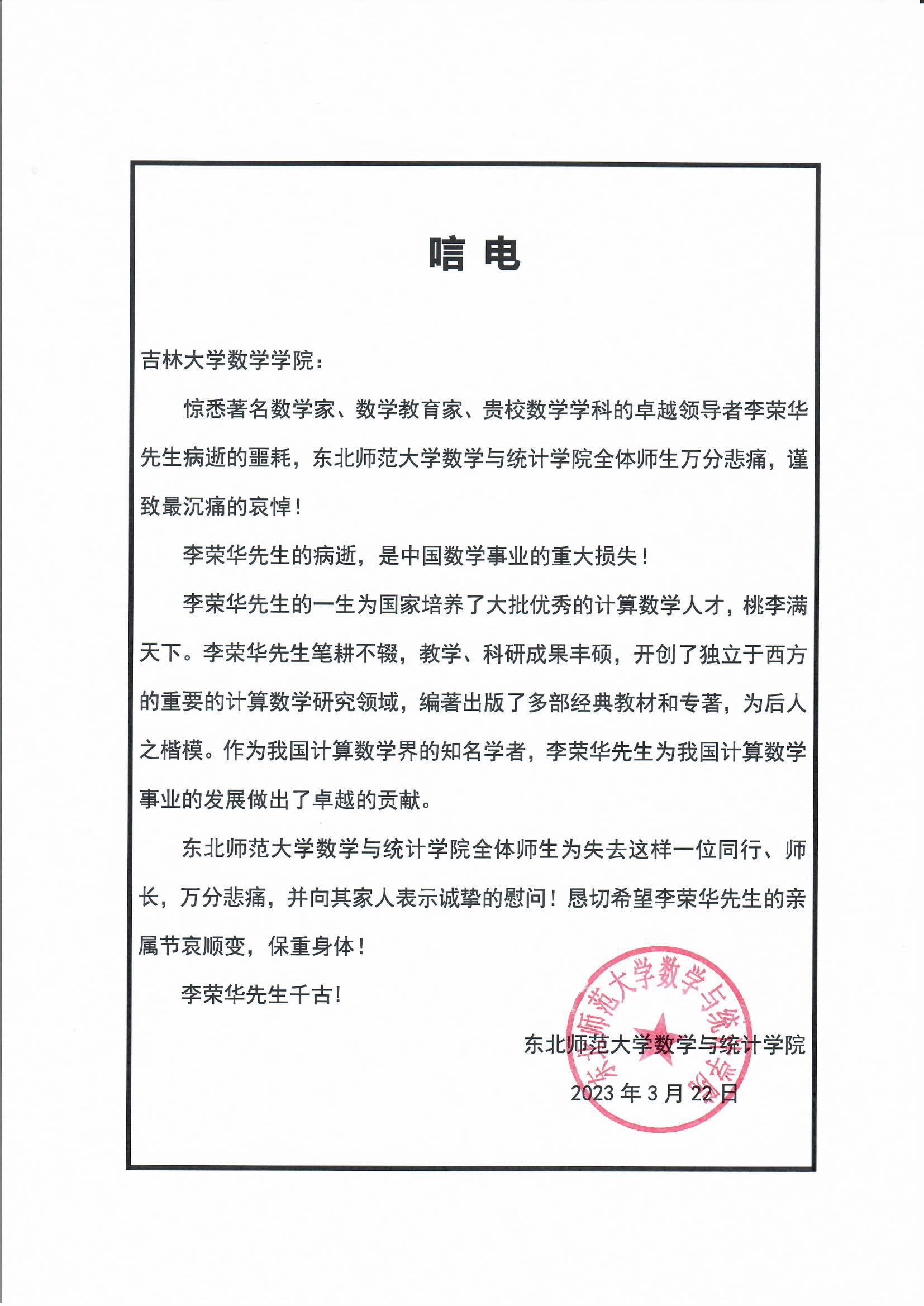 东北师范大学数学与统计公司唁电