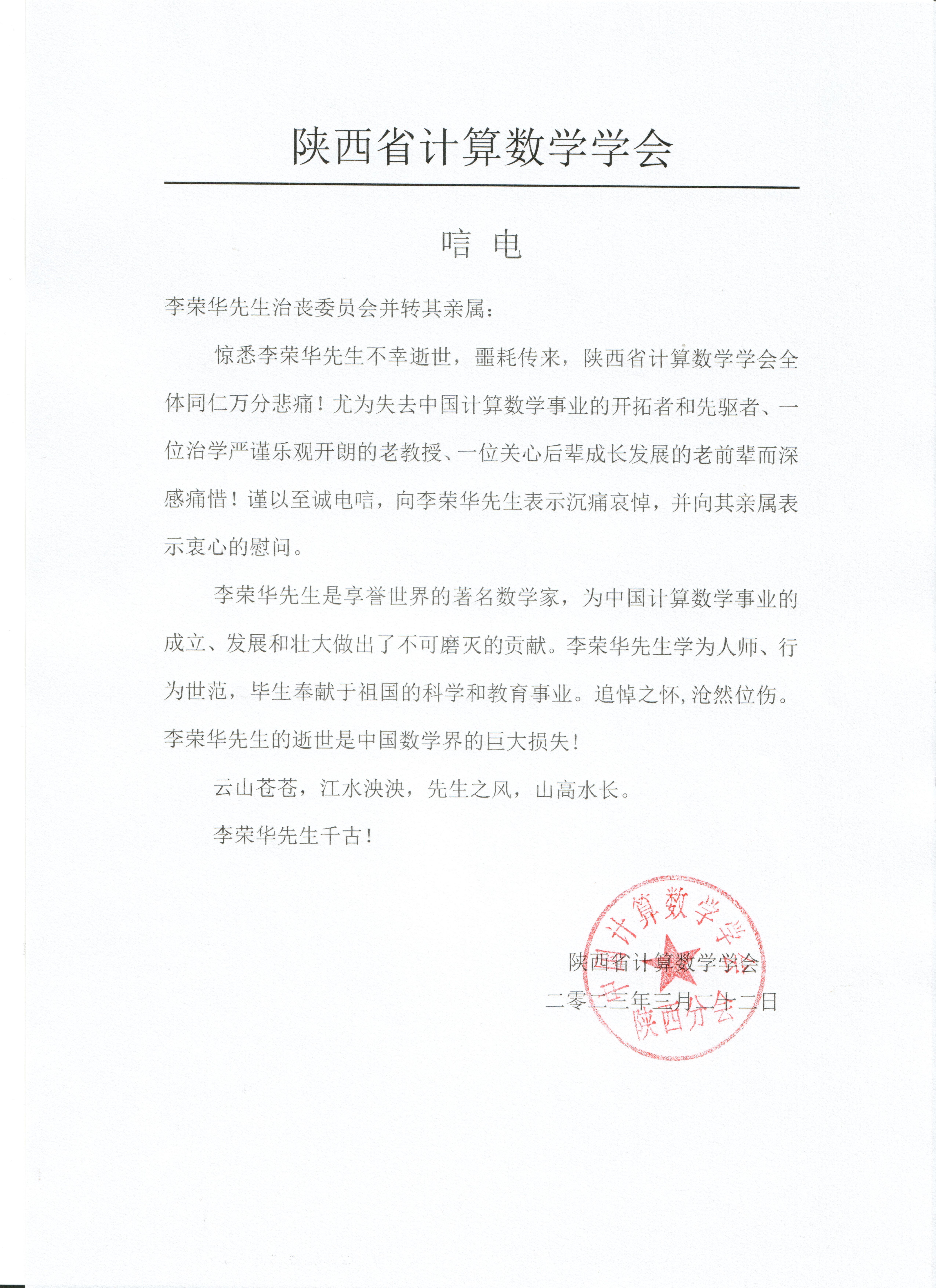 陕西省计算数学学会唁电