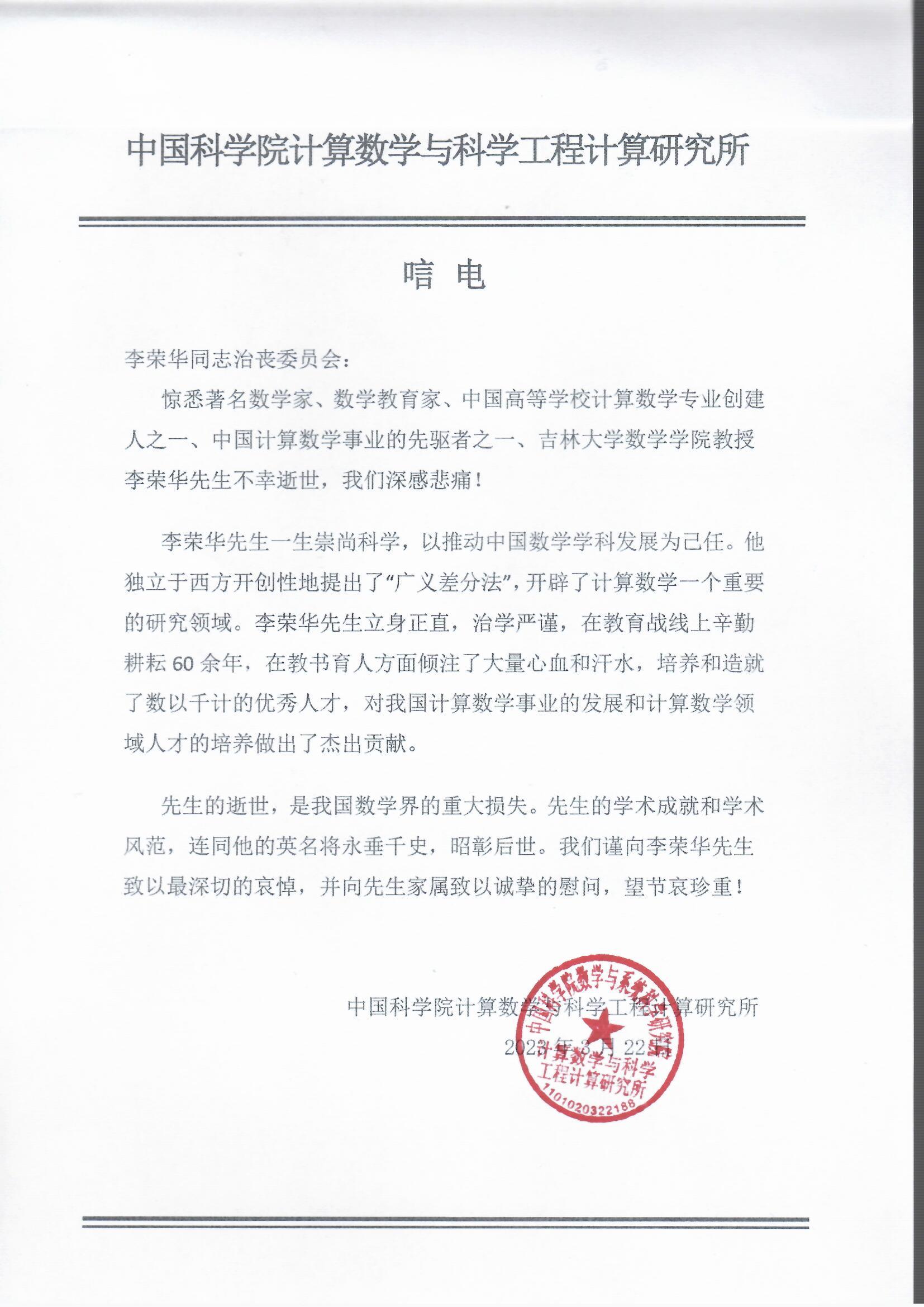 中国科公司计算数学与科学工程计算研究所唁电