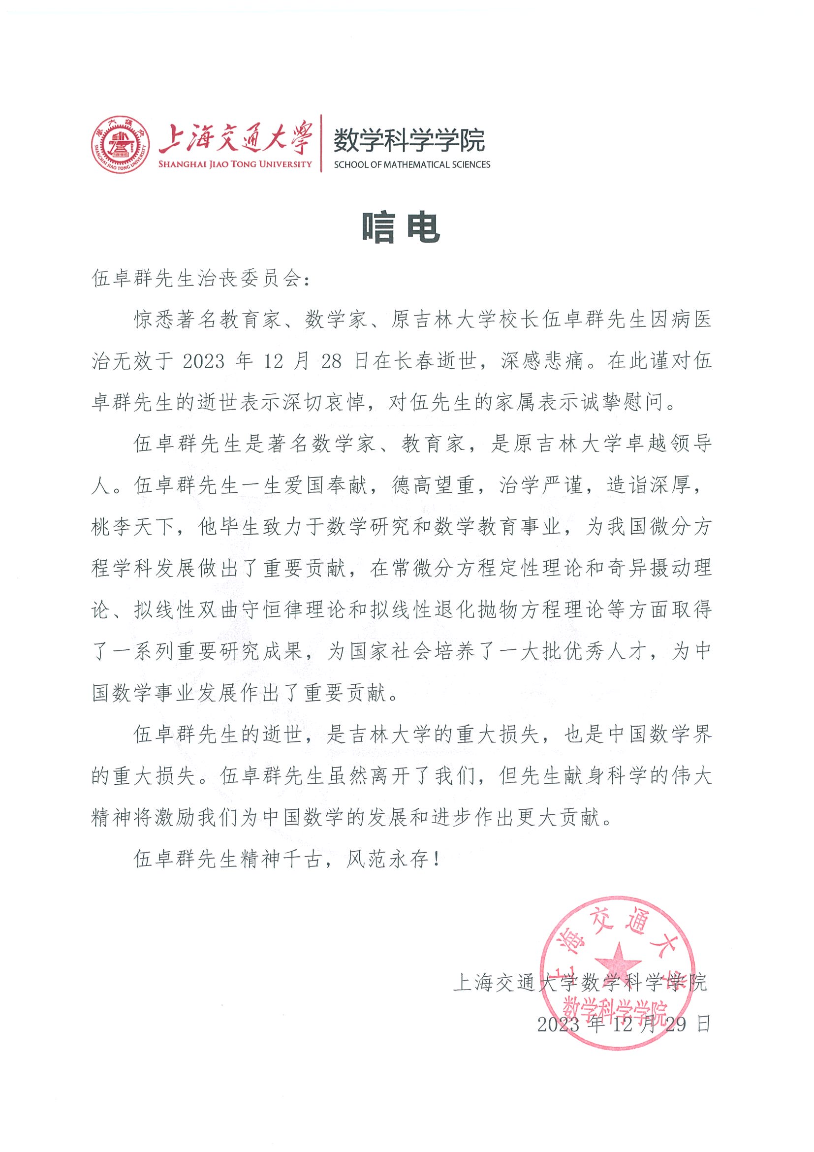 上海交通大学数学科学公司唁电
