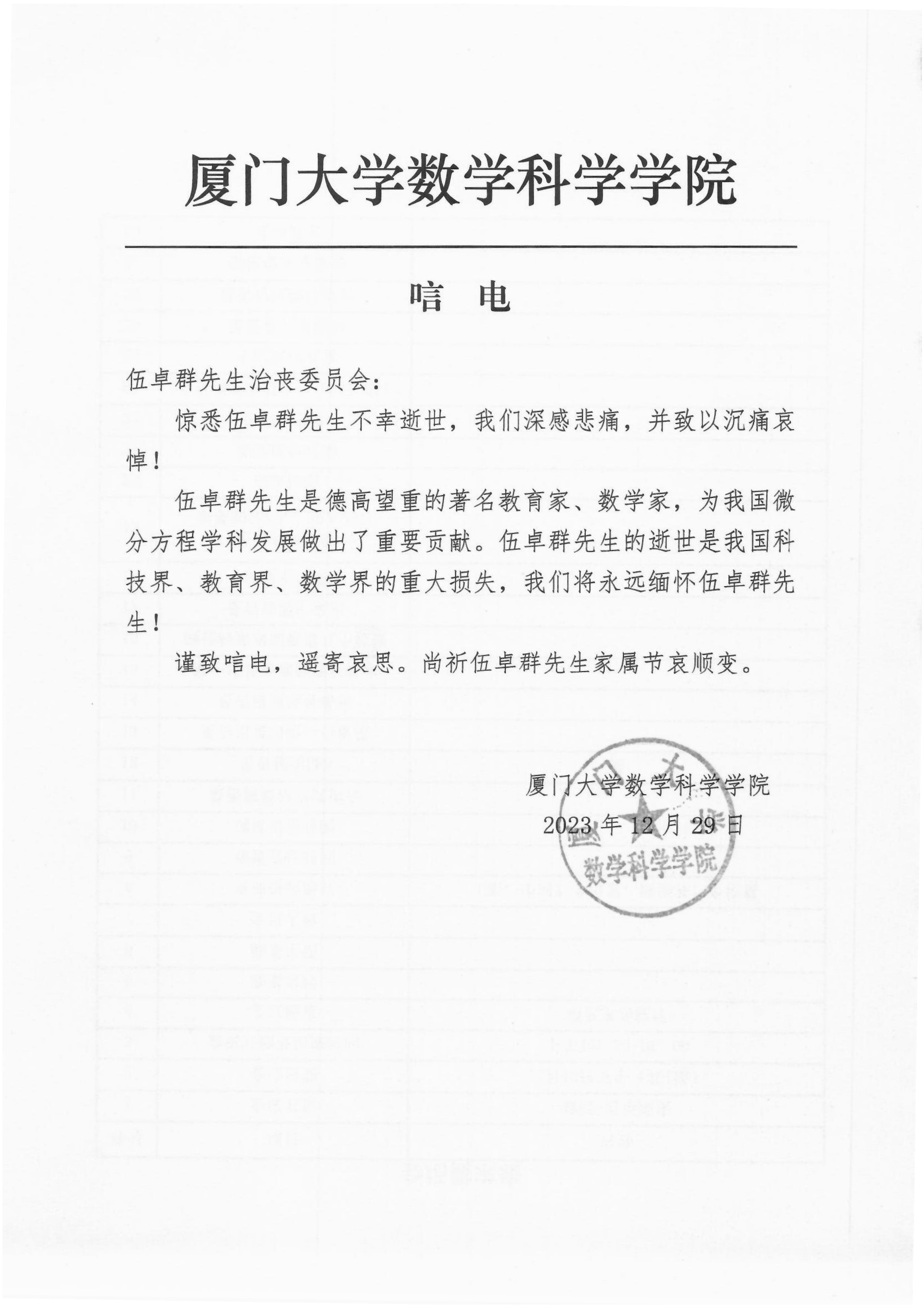 厦门大学数学科学公司唁电