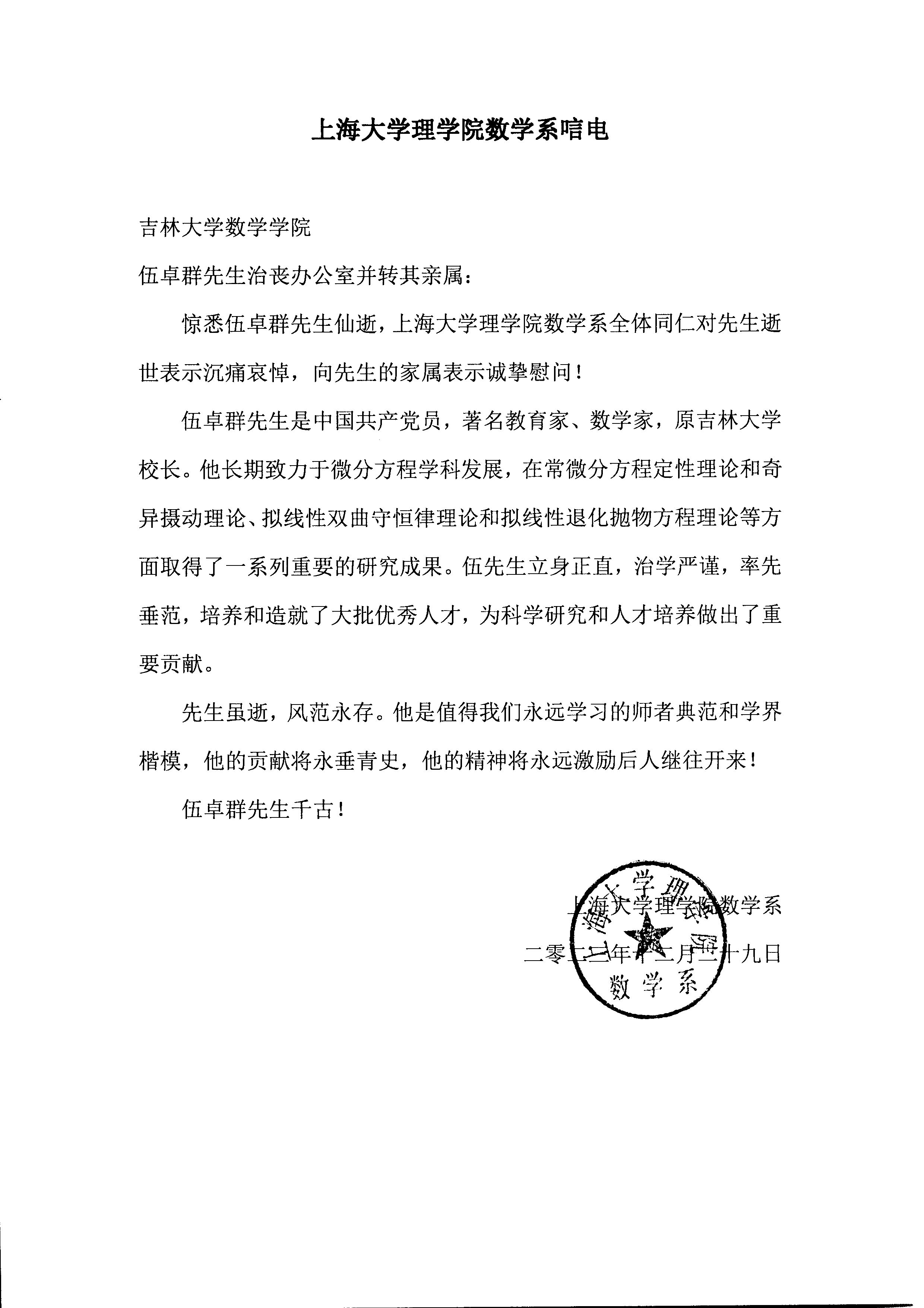 上海大学理公司数学系唁电