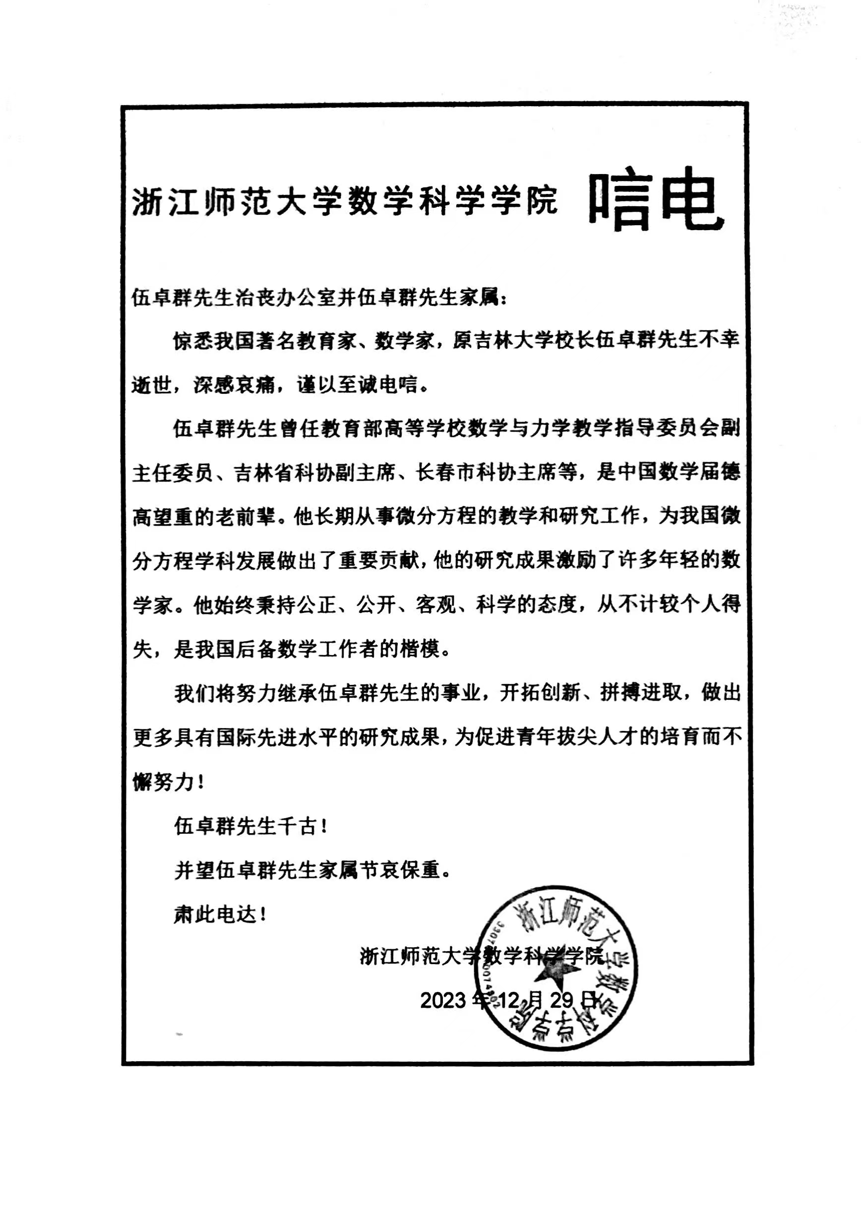 浙江师范大学数学科学公司唁电