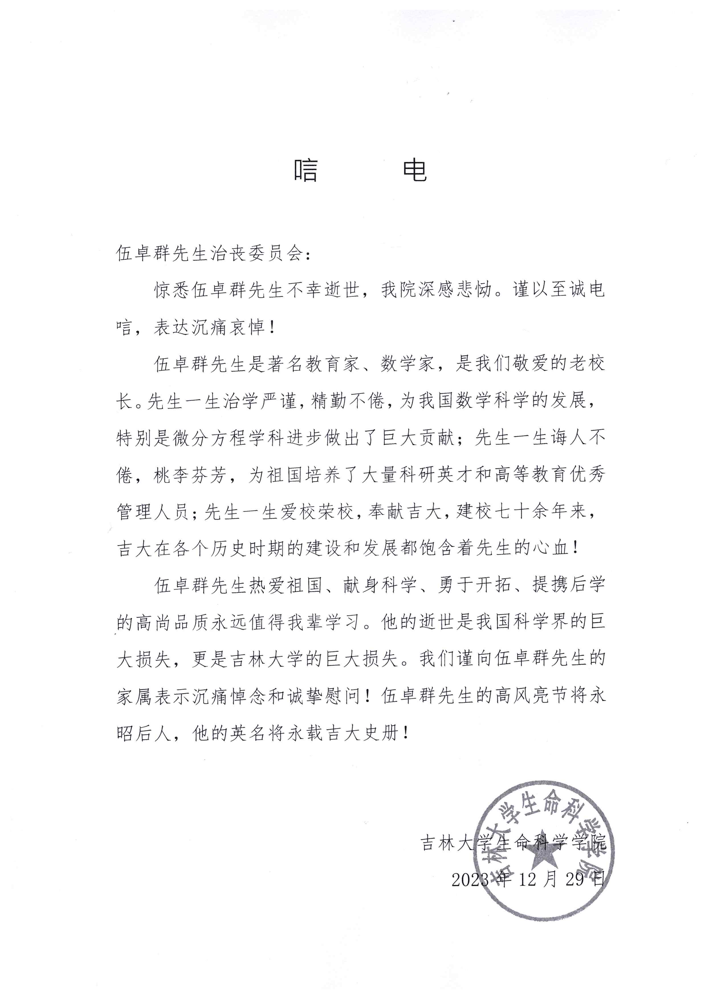 吉林老员工命科学公司唁电