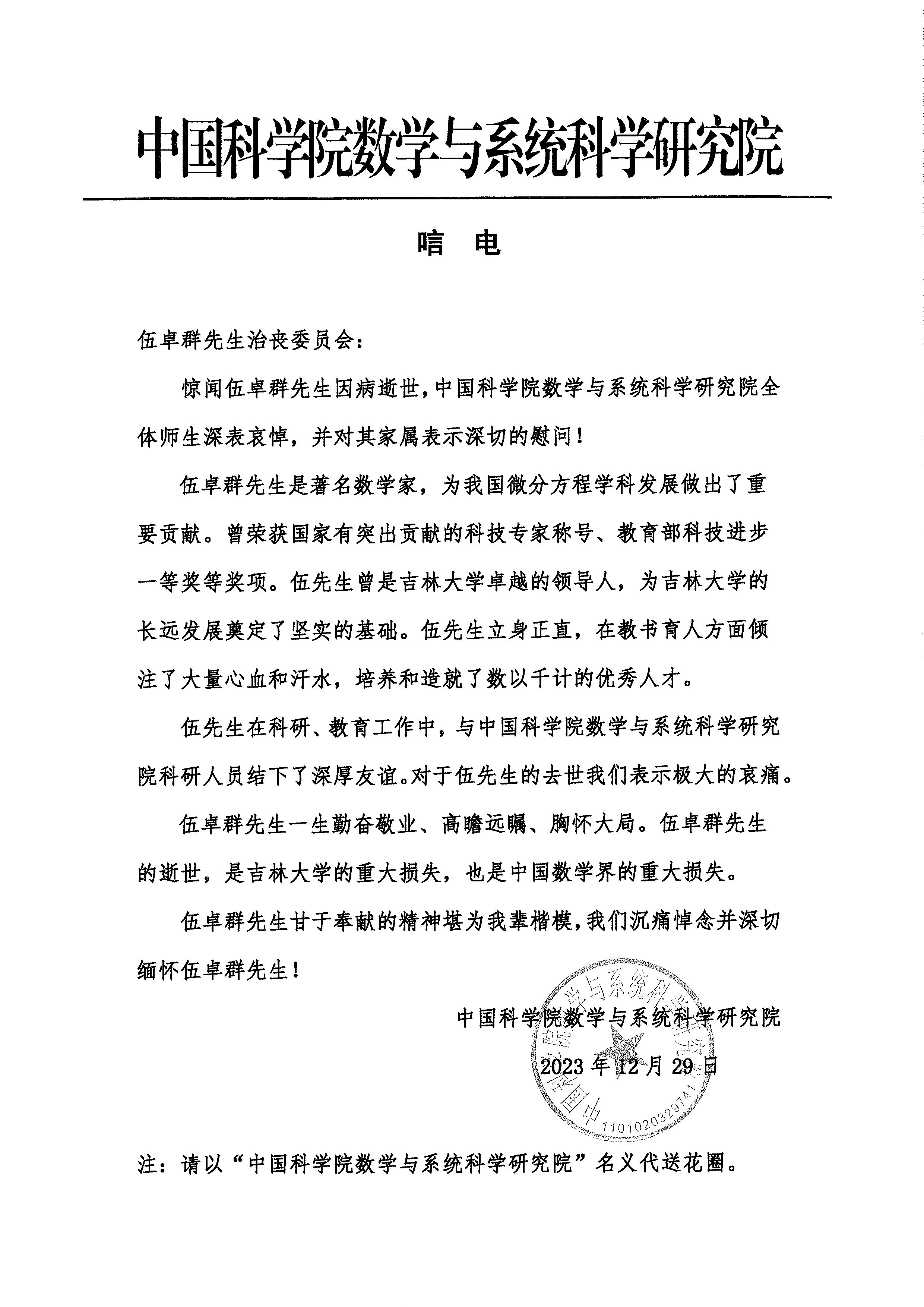 中国科公司数学与系统科学研究院唁电