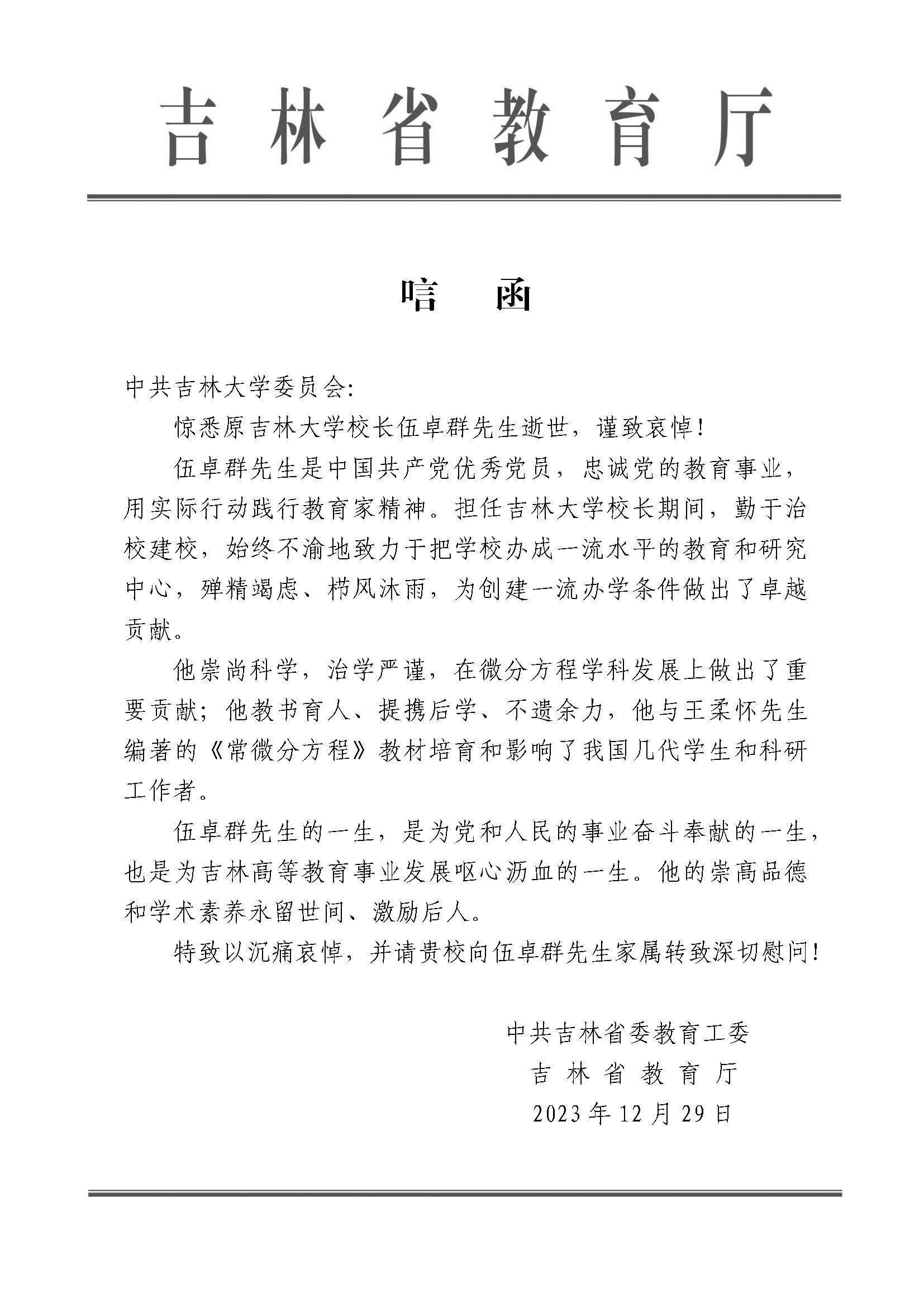 吉林省教育厅唁电