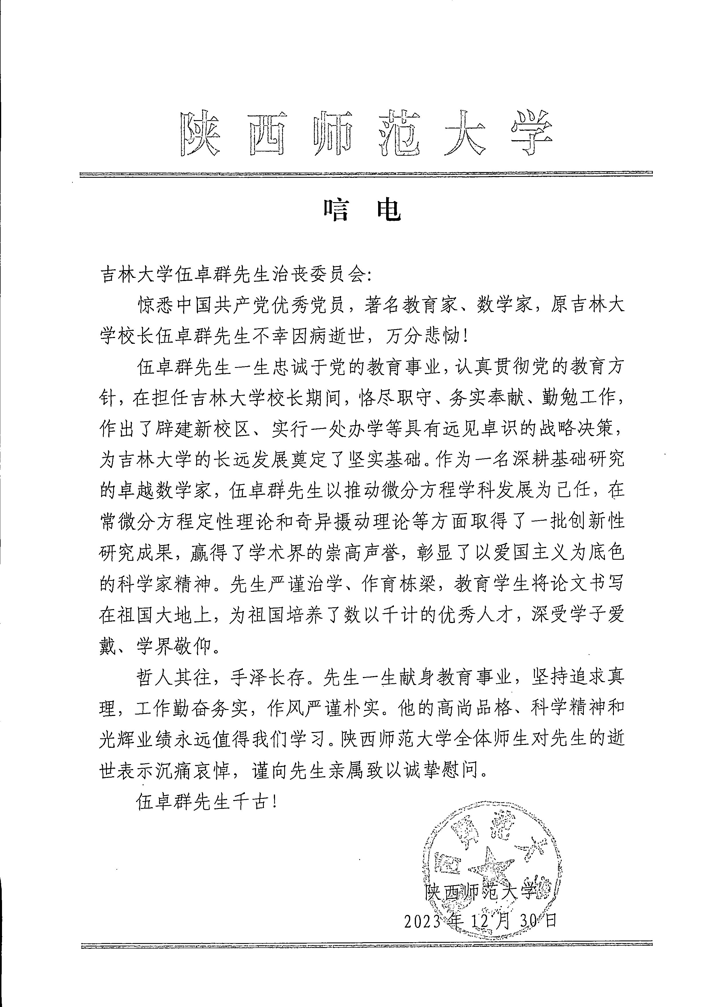 陕西师范大学唁电