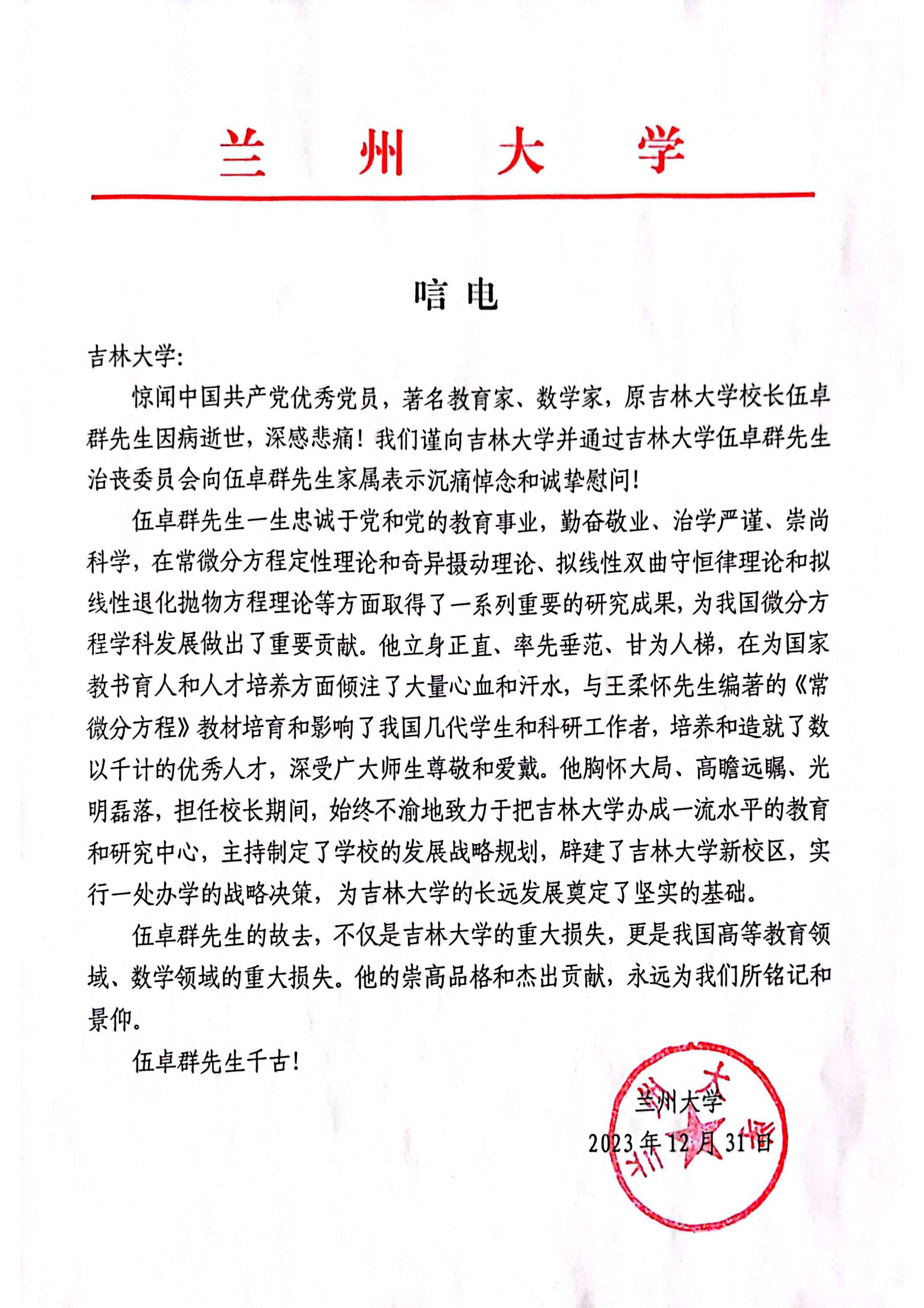 兰州大学唁电